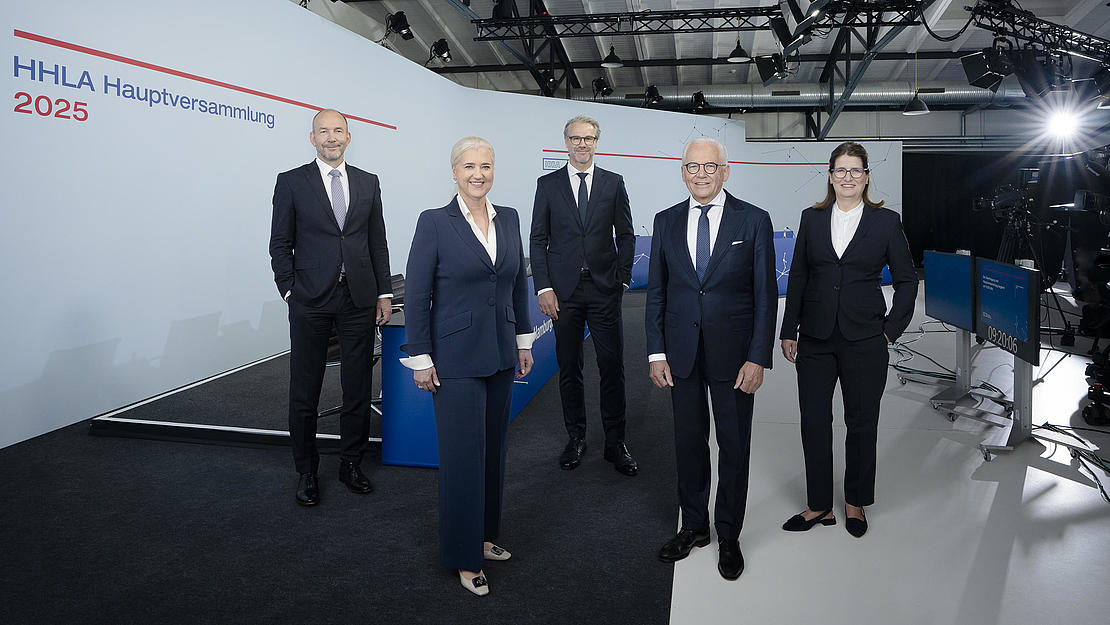 HHLA Executive Board with Supervisory Board Chairman at the 2025 Annual General Meeting (from left to right: Executive Board member Jens Hansen, Chief Executive Officer Angela Titzrath, Executive Board member Torben Seebold, Supervisory Board Chairman Prof. Dr. Rüdiger Grube and Executive Board member Annette Geiß)