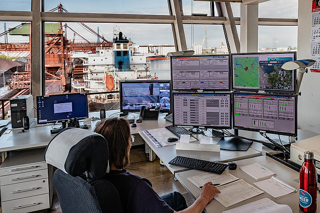 The operations are monitored from a control station on the upper floor of the Hansaport office building. Two monitors give the employee on duty detailed information about the four unloading cranes; two other screens show the values of the belt scales of the material flow and current weather data. These are important because Hansaport must avoid the formation of any dust. If necessary, sprinkler systems are switched on in the 35-hectare yard.
