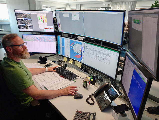 Nevertheless, experts like shift leader Ralf Meggers, who ensures trouble-free operations throughout the terminal, are irreplaceable – especially in the control centre. His many data monitors normally don’t provide him with a view of the block storage itself. Specialists like Martin Schlüter – a technology operator in charge of monitoring the storage crane system – keep an eye on it for him. It’s a good thing this monitoring system works. Recently, someone accidentally crossed a photoelectric sensor and triggered an emergency safety stop down in the block storage area. Schlüter stops the piercing alarm and, after receiving the all-clear from a colleague on site, releases the track.