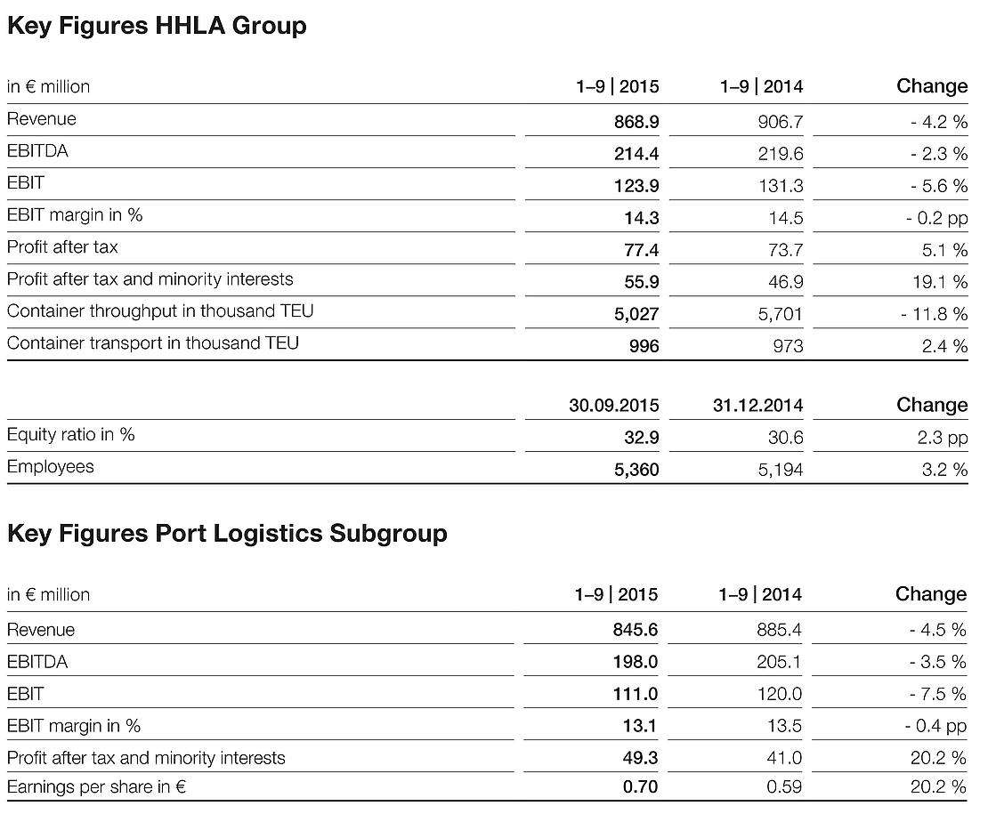 The Port Logistics subgroup recorded an encouraging profit after tax and minority interests – a figure of relevance to shareholders. It increased by 20.2 percent to € 49.3 million in the first three quarters of 2015 due to the positive overall performance of HHLA’s majority-owned companies. Earnings per Class A share of € 0.70 were correspondingly 20.2 percent above the previous year’s figure of € 0.59.