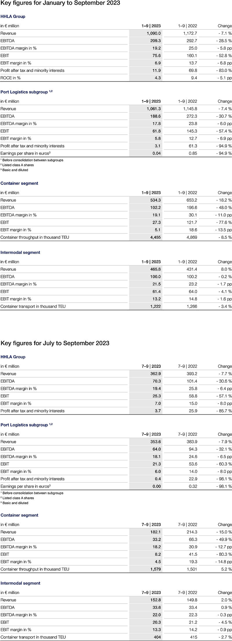 The revenue and earnings performance of Hamburger Hafen und Logistik AG (HHLA) declined in the first nine months of 2023. The ongoing war in Ukraine, geopolitical tensions, inflation and rising interest rates put pressure on consumer and industrial demand and are continuing to hinder the global economic recovery in the aftermath of the pandemic. HHLA’s business performance in the first half of 2023 already reflected the difficult conditions in the market. The significant drop in volumes due to the economic situation that was evident in the first half of 2023 abated in the Container segment thanks to a stronger third quarter, but continued to be challenging for container transport. In addition, shorter dwell times for containers handled at the Hamburg container terminals compared to the same period of the previous year resulted in reduced storage fees. Revenue in the HHLA Group reduced by 7.1 percent to € 1,090.0 million (previous year: € 1,172.7 million). The Group operating result (EBIT) decreased by 52.8 percent to € 75.6 million (previous year: € 160.1 million). The EBIT margin amounted to 6.9 percent (previous year: 13.7 percent). Profit after tax and minority interests came to € 11.9 million (previous year: € 69.8 million).