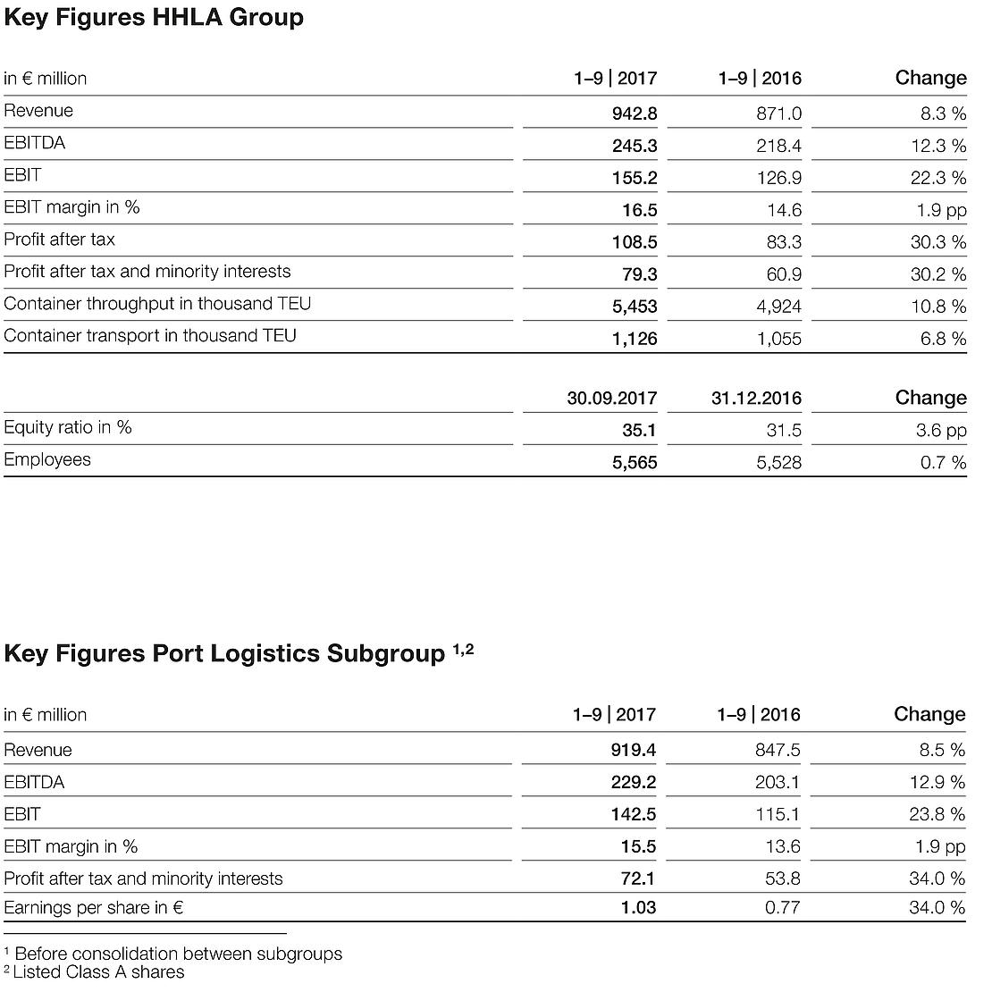 Business remained strong and continued to develop positively at Hamburger Hafen und Logistik AG (HHLA) in the first nine months of 2017. While Group revenue rose by 8.3 percent year-on-year to € 942.8 million, the operating result (EBIT) increased by 22.3 percent to € 155.2 million. The profit after tax and minority interests – the relevant figure for shareholders – grew by 30.2 percent to € 79.3 million. Volumes went up by 10.8 percent in container throughput and 6.8 percent in container transport.