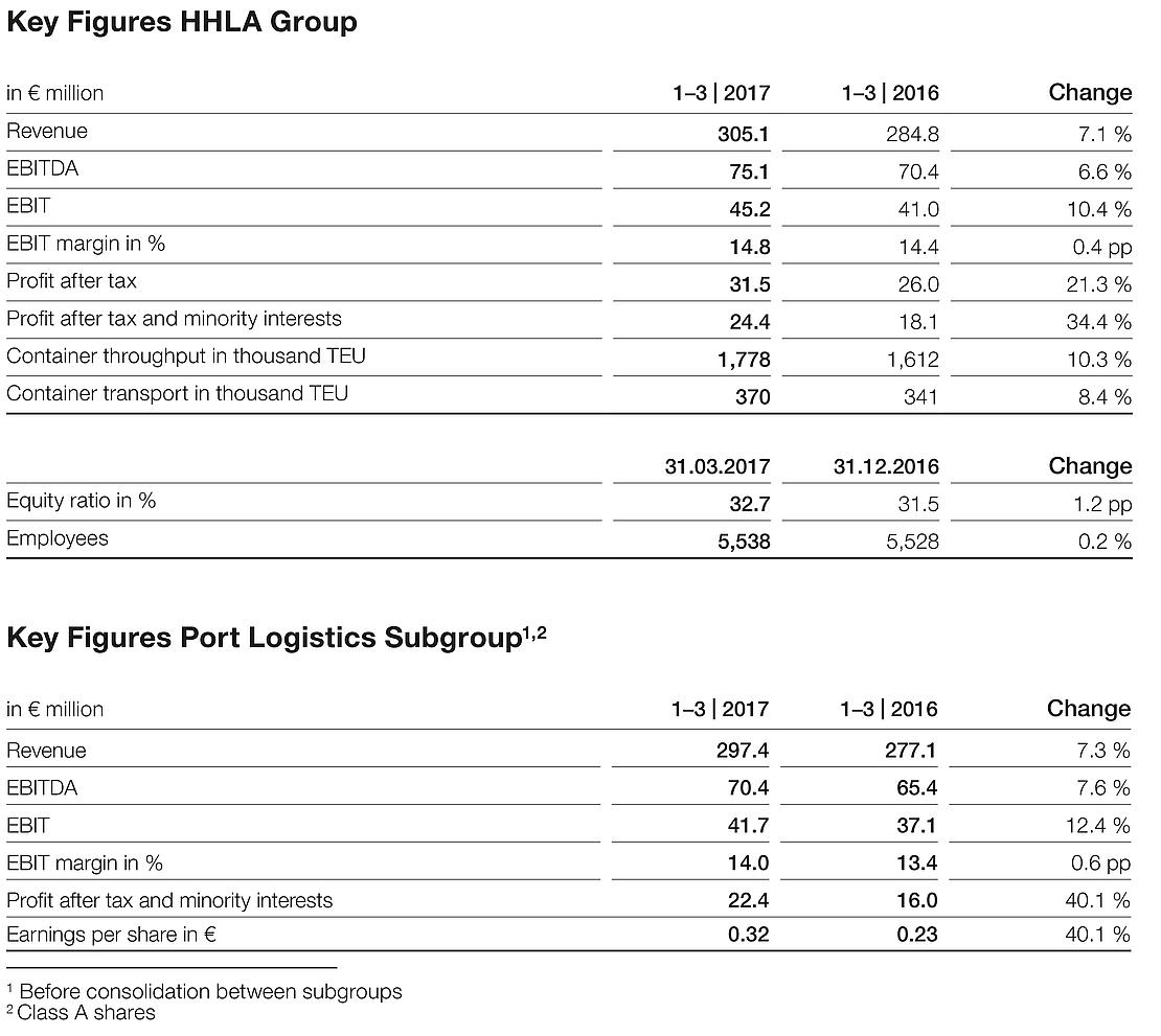 The 2017 financial year has started well for Hamburger Hafen und Logistik AG (HHLA). At the end of the first quarter, the Group’s key performance indicators are mainly well above the previous year’s level. Revenue was up 7.1 % year-on-year at € 305.1 million and at € 45.2 million, the operating result (EBIT) was also above the prior-year figure of € 41.0 million. The profit after tax and minority interests increased by 34.4 % year-on-year to € 24.4 million. In particular, a significant increase in container throughput had a positive impact on the result.