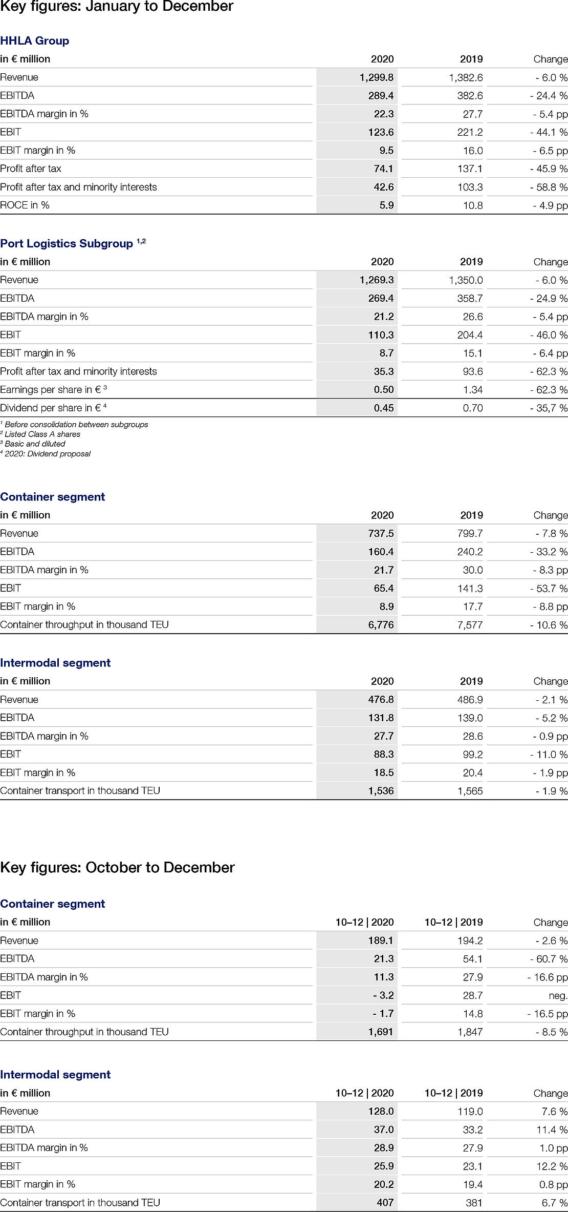 In a financial year defined by the coronavirus pandemic and the associated social and economic upheavals, Hamburger Hafen und Logistik AG (HHLA) achieved a positive Group operating result (EBIT) of € 123.6 million in 2020 (previous year: € 221.2 million). In addition to decreases in volume as a result of the pandemic and changes in the market share, provisions amounting to approximately € 43 million also had an impact on the operating result. The provisions will be used to implement restructuring measures in the Container segment. Without the provisions, the Group EBIT would have been approximately € 167 million. Compared with the previous year, container throughput decreased by 10.6 percent to 6,776 thousand TEU. Transport volume amounted to 1,536 thousand TEU, a slight decrease (- 1.9 percent) on the high level of the previous year. Revenue for the HHLA Group decreased by 6.0 percent to € 1,299.8 million (previous year: € 1,382.6 million). Profit after tax and minority interests dropped by 58.8 percent to € 42.6 million (previous year: € 103.3 million).