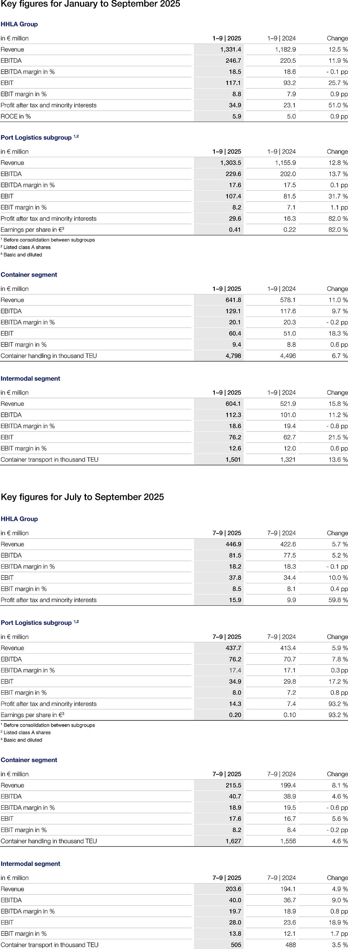 The listed Port Logistics subgroup recorded a strong increase of 12.8 percent in revenue to € 1,303.5 million in the first nine months of 2025 (previous year: € 1,155.9 million). The operating result (EBIT) also rose strongly by 31.7 percent to € 107.4 million (previous year: € 81.5 million). The EBIT margin rose year-on-year by 1.1 percentage points to 8.2 percent (previous year: 7.1 percent). Profit after tax and minority interests came to € 29.6 million (previous year: € 16.3 million). Earnings per share thus amounted to € 0.41 (previous year: € 0.22).