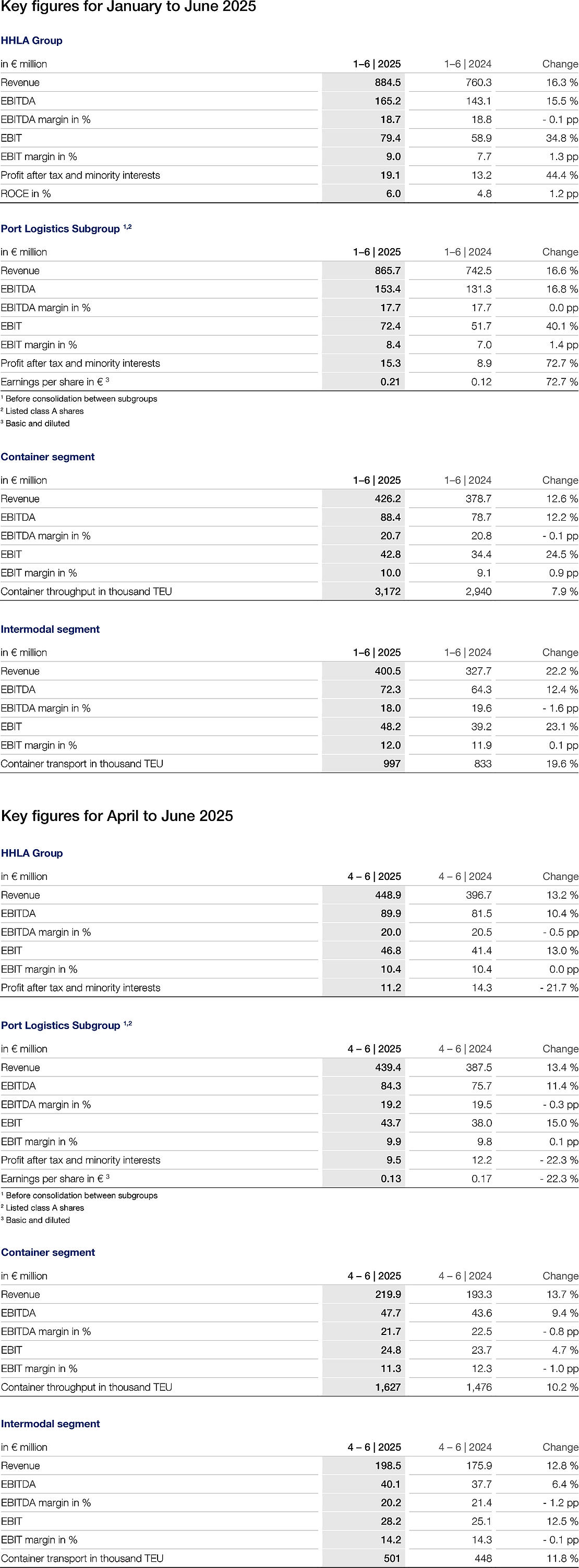 The first half of 2025 continued to be defined by a weak economy in Germany, geopolitical conflicts and growing uncertainty caused by US trade policy. In this challenging environment, Hamburger Hafen und Logistik AG (HHLA) increased its revenue and operating result strongly compared with the previous year. Revenue in the HHLA Group rose by 16.3 percent to € 884.5 million (previous year: € 760.3 million). The Group operating result (EBIT) climbed by 34.8 percent to € 79.4 million (previous year: € 58.9 million). The EBIT margin amounted to 9.0 percent (previous year: 7.7 percent). Profit after tax and minority interests came to € 19.1 million (previous year: € 13.2 million).