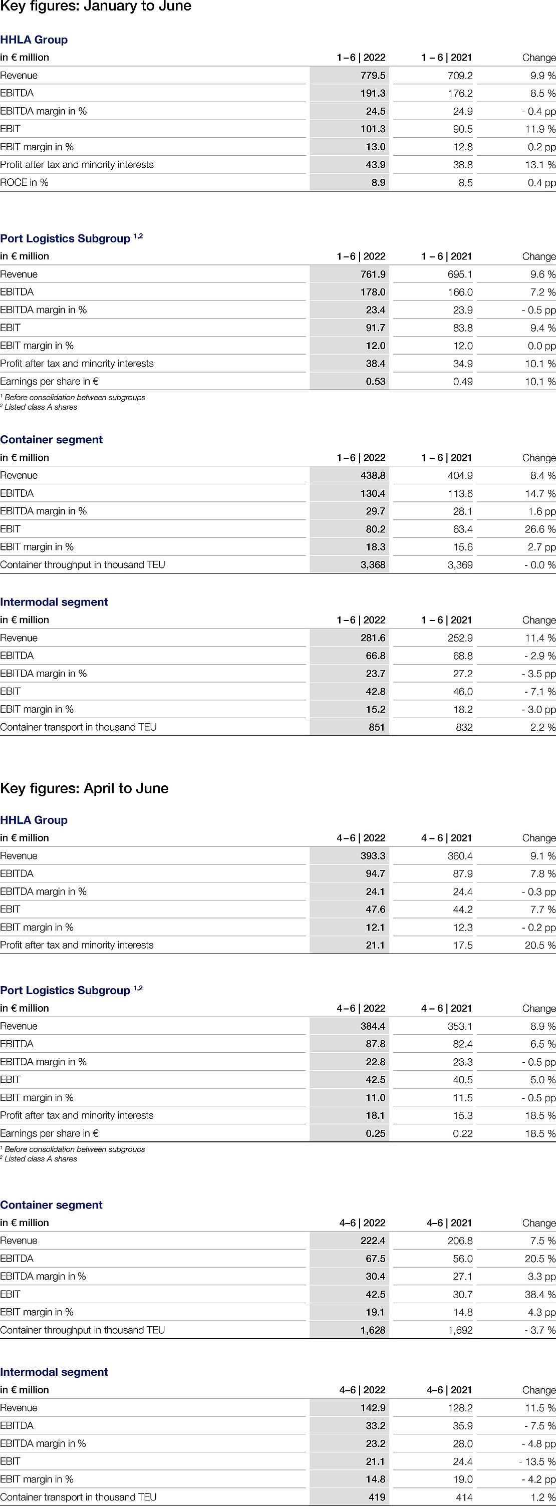 - Chairwoman of the Executive Board, Angela Titzrath: “HHLA has successfully completed the first half of 2022, but the disruptions to global supply chains continue to pose major operational challenges for us.”