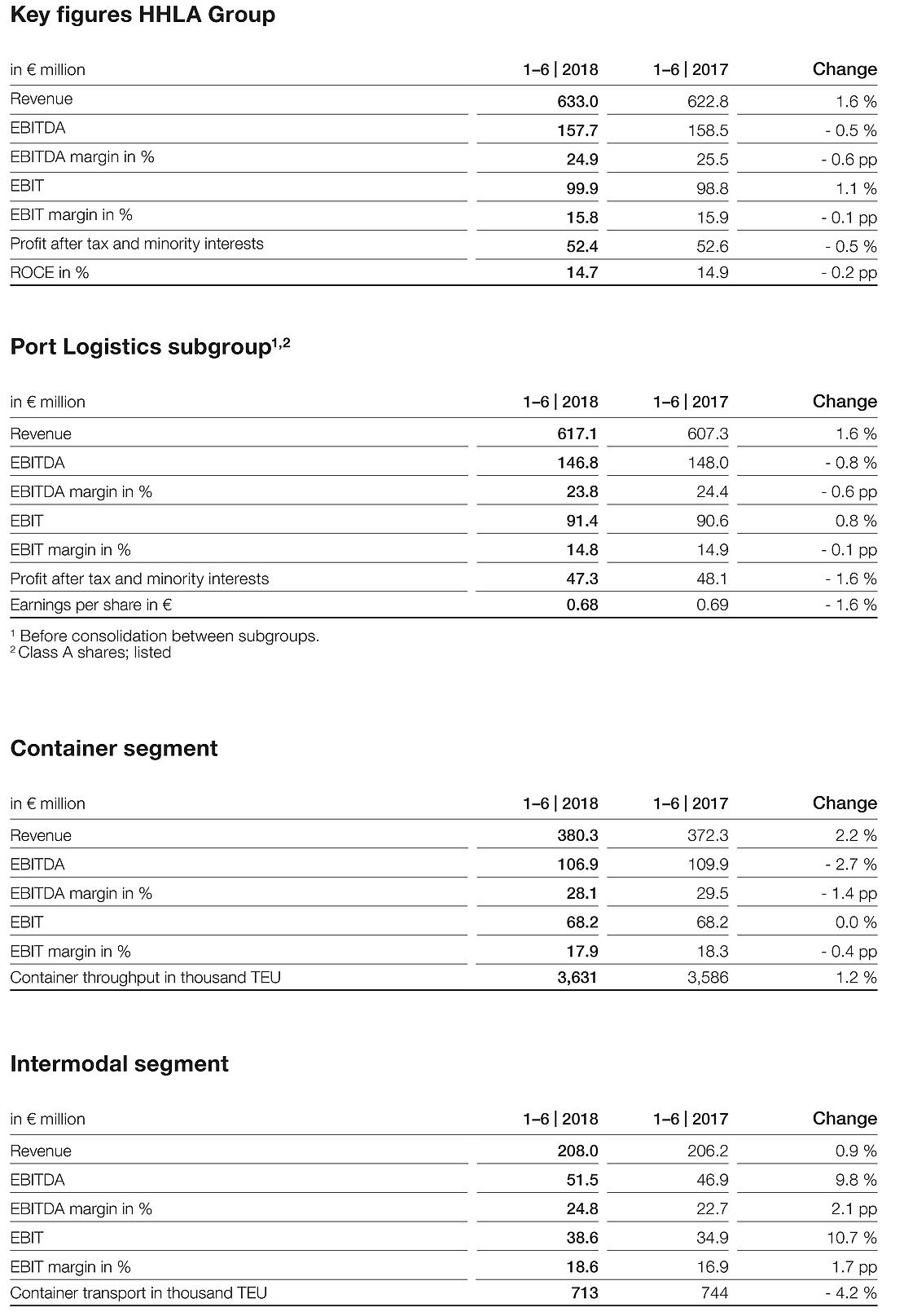 In the first half of 2018, Hamburger Hafen und Logistik AG (HHLA) improved on the already strong prior-year result. Both Group revenue and the Group operating result increased slightly in the first six months against the same period of the previous year, which was already very strong. This development was driven by both subgroups, the listed Port Logistics subgroup and the Real Estate subgroup. A 1.2 percent increase in container throughput was recorded. As projected, container transport declined by 4.2 percent on account of the realignment of Polzug activities following its successful integration into the Metrans group. Revenue in the Port Logistics subgroup was up by 1.6 percent.