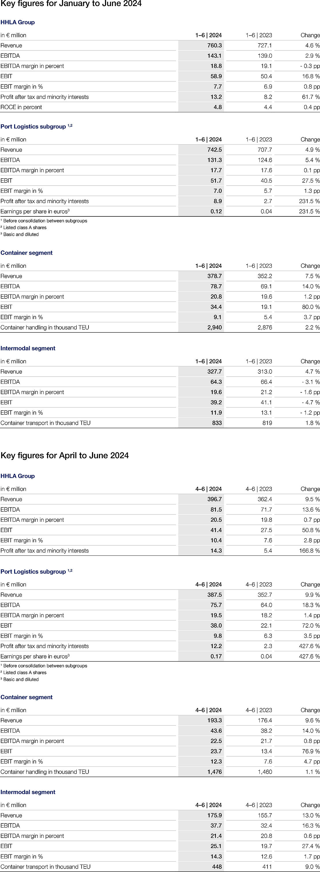 After a weak start to the year due to a challenging environment, Hamburger Hafen und Logistik AG (HHLA) concluded the first half of 2024 with positive figures for both revenue and earnings. In addition to rises in container handling and container transport, an advantageous revenue mix and the expansion of the European network also had a beneficial effect. Group revenue rose by 4.6 percent to € 760.3 million (previous year: € 727.1 million). The Group operating result (EBIT) climbed by 16.8 percent to € 58.9 million (previous year: € 50.4 million). The EBIT margin amounted to 7.7 percent (previous year: 6.9 percent). Consolidated profit after tax and minority interests came to € 13.2 million (previous year: € 8.2 million).