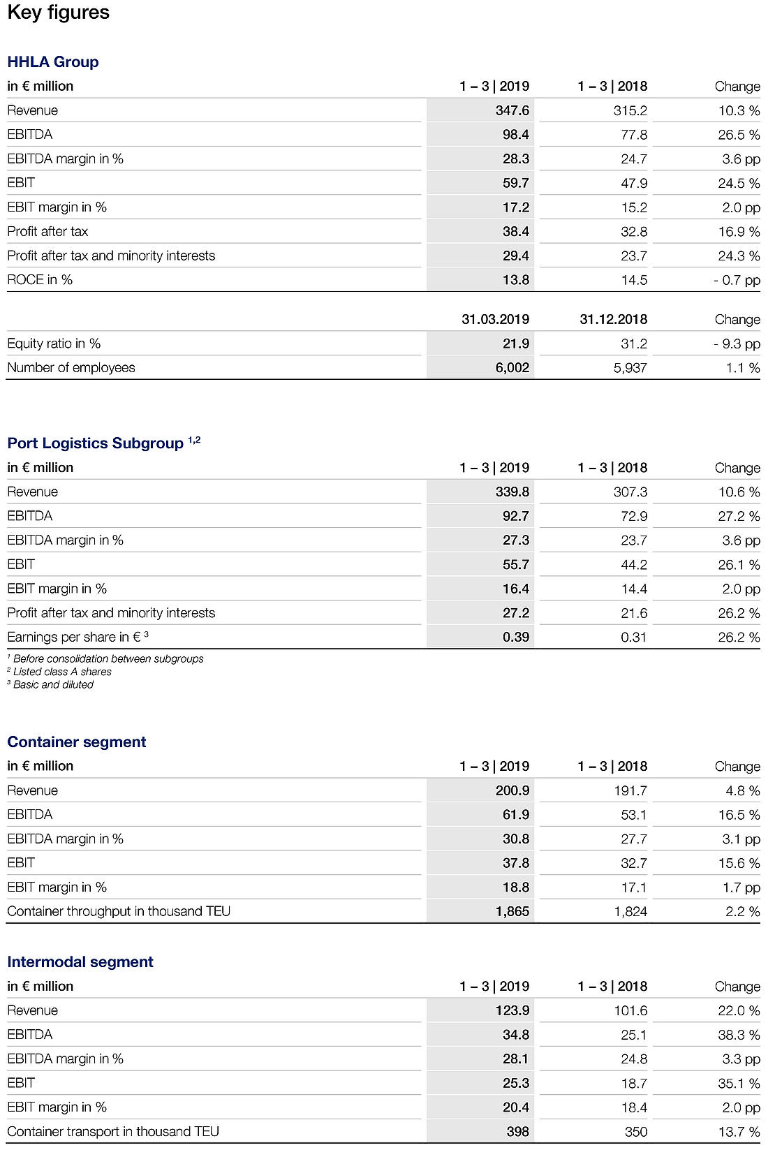 The Hamburger Hafen und Logistik AG (HHLA) enjoyed a successful start to the 2019 financial year. In a challenging market environment, revenue and the operating result rose strongly in the first three months along with further improvements in profitability. Container throughput increased slightly, partly due to the successful integration of the Estonian terminal operator HHLA TK Estonia last year. Extremely positive performance in container transport and property management led to a revenue of € 347.6 million (+ 10.3 %). The operating result (EBIT) was far above the level of last year, increasing by € 11.8 million or 24.5 % to € 59.7 million. Effects from the initial application of the IFRS 16 standard only resulted in an increase of € 3.5 million.