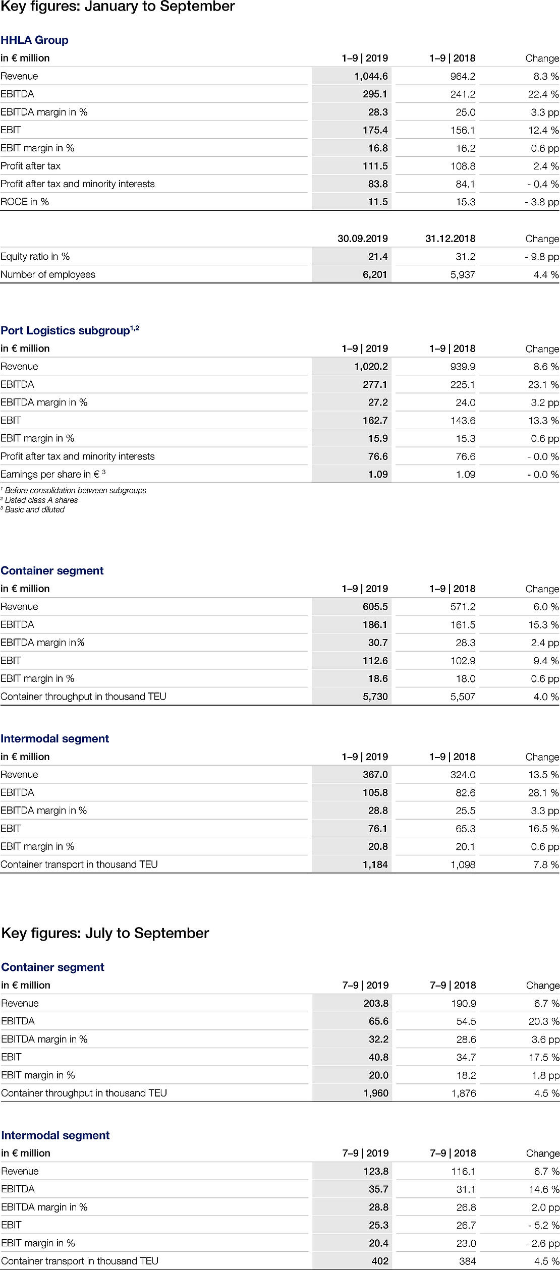 Hamburger Hafen und Logistik AG (HHLA) continued its positive performance in the first nine months of 2019. The company recorded another significant increase in revenue and saw strong growth in its operating result. It was again possible to improve profitability year-on-year in a challenging market environment. Container throughput increased moderately due to the successful integration of the Estonian terminal operator HHLA TK Estonia, which was acquired last year, and improved slightly at the Hamburg terminals. A significant rise in container transport was achieved. Including a significant increase in revenue from the Logistics segment and a once again moderate increase in revenue from property management, this led to total revenue of € 1,044.6 million (+ 8.3 percent). The operating result (EBIT) improved strongly by € 19.3 million, or 12.4 percent, to € 175.4 million. The positive effects of the initial application of IFRS 16 in the EBIT amounted to approximately € 10.6 million.