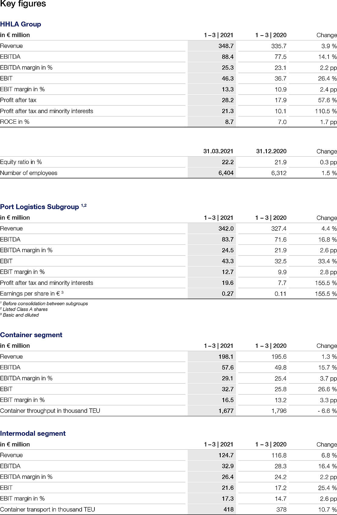 The listed Port Logistics subgroup recorded a 4.4 percent rise in revenue to € 342.0 million in the first three months of 2021. The operating result (EBIT) increased significantly by 33.4 percent to € 43.3 million. The EBIT margin improved by 2.8 percentage points to 12.7 percent.