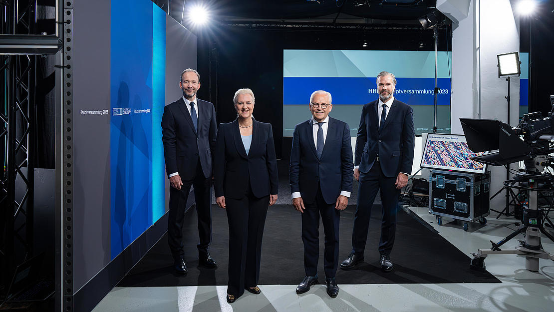 HHLA Executive Board with Supervisory Board Chairman at the 2023 Annual General Meeting (from left to right: HHLA Executive Board member Jens Hansen, HHLA Executive Board Chairwoman Angela Titzrath, Supervisory Board Chairman Prof. Dr. Rüdiger Grube, HHLA Executive Board member Torben Seebold)