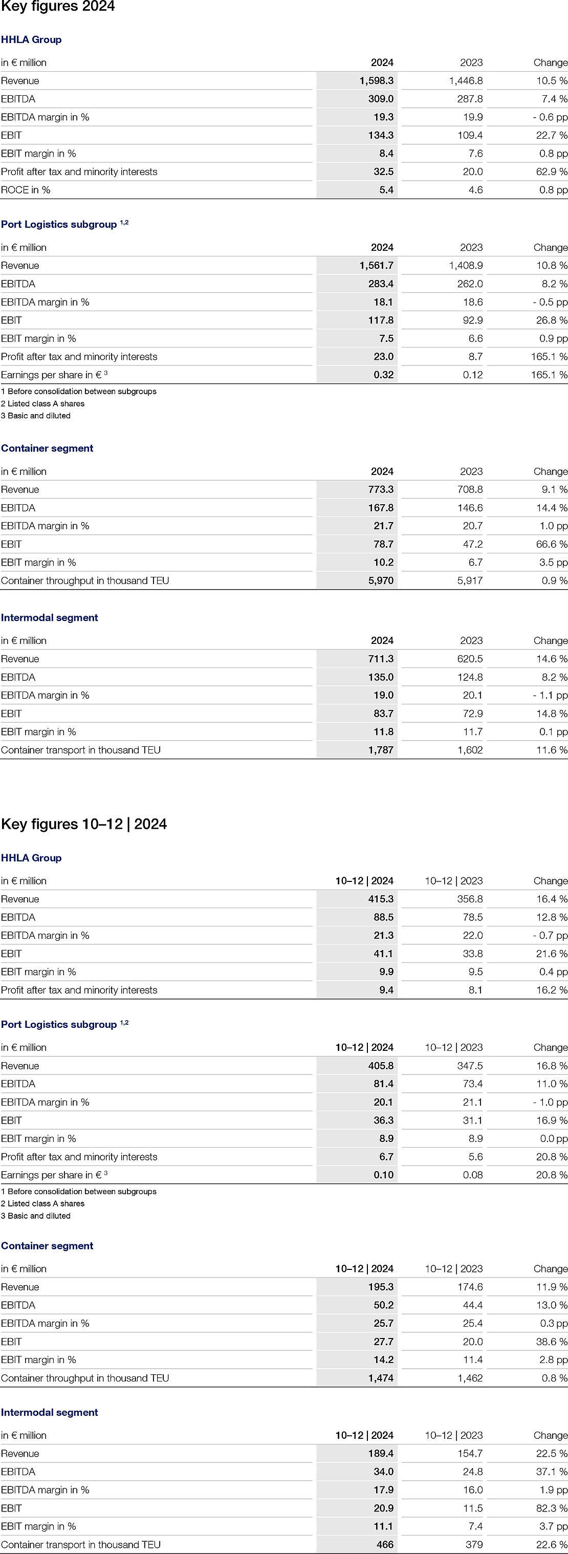 For the current financial year, a strong year-on-year increase is expected for both container throughput and container transport in the Port Logistics subgroup. Strong year-on-year growth is also expected for revenue as compared with 2024. Moreover, the Port Logistics subgroup is targeting EBIT of between € 180 million and € 220 million. All segments are expected to achieve strong growth.