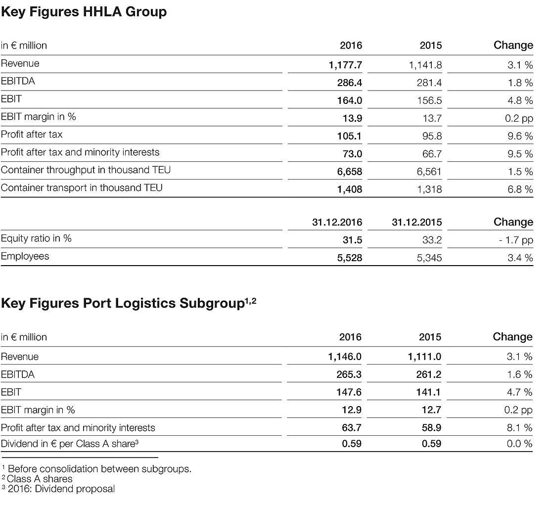 In 2016, HHLA reported Group revenue of nearly € 1.2 billion. The Port Logistics subgroup generated revenue of approximately € 1.1 billion. Both the Group and the subgroup have thereby exceeded the previous year’s figure by 3.1 %. While the operating result (EBIT) for the Group went up by 4.8 % to € 164.0 million, the operating result of the Port Logistics subgroup increased by 4.7 % to € 147.6 million. The operating result (EBIT) was thereby slightly above the figure forecast last autumn.