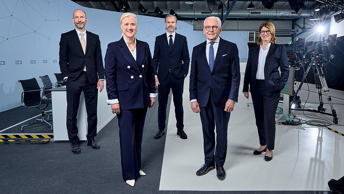HHLA Executive Board with Supervisory Board Chairman at the 2024 Annual General Meeting (from left to right: Executive Board member Jens Hansen, Chief Executive Officer Angela Titzrath, Executive Board member Torben Seebold, Supervisory Board Chairman Prof. Dr. Rüdiger Grube and Executive Board member Annette Geiß)