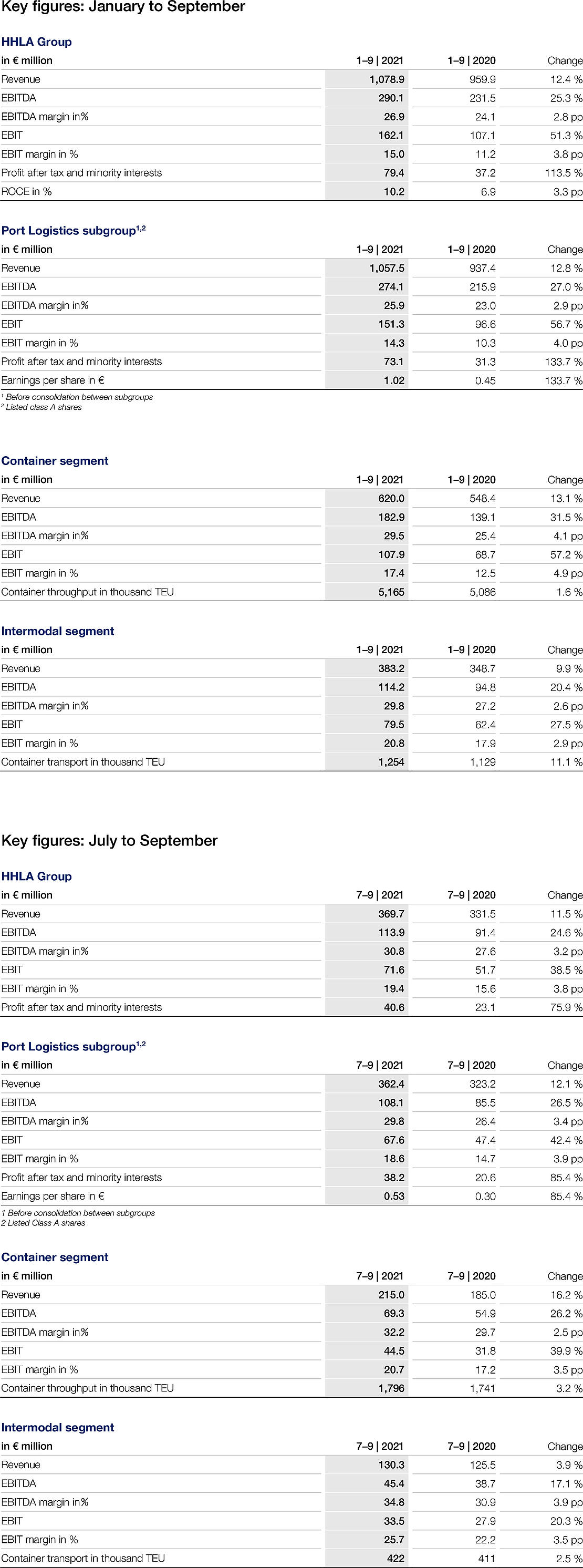 The listed Port Logistics subgroup recorded a strong increase of 12.8 percent in revenue to € 1,057.5 million in the first nine months (previous year: € 937.4 million). The operating result (EBIT) rose year-on-year by 56.7 percent to € 151.3 million (previous year: € 96.6 million). The EBIT margin improved by 4.0 percentage points to 14.3 percent.