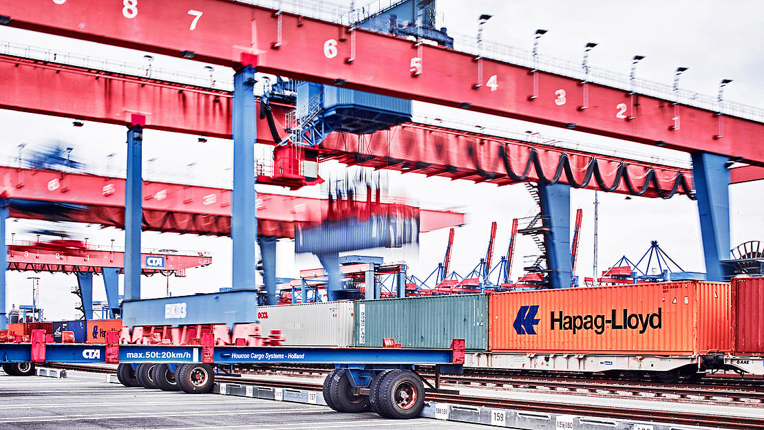 Container handling by rail crane at the Container Terminal Altenwerder.