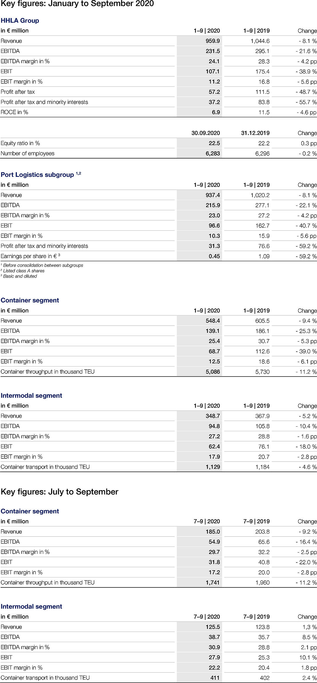 As a result of the Group’s performance in the first nine months of 2020 and the continued uncertainties on possible restrictions to contain the coronavirus pandemic which have an impact on economic activity, the HHLA Executive Board maintains its assessment that it is not possible to make a reliable forecast under the current conditions. It can be assumed, however, that revenue and the operating result (EBIT) for the Port Logistics subgroup will be much lower than in the previous year. This is mainly the result of the sharp decline in container throughput and significant loss in container transport.