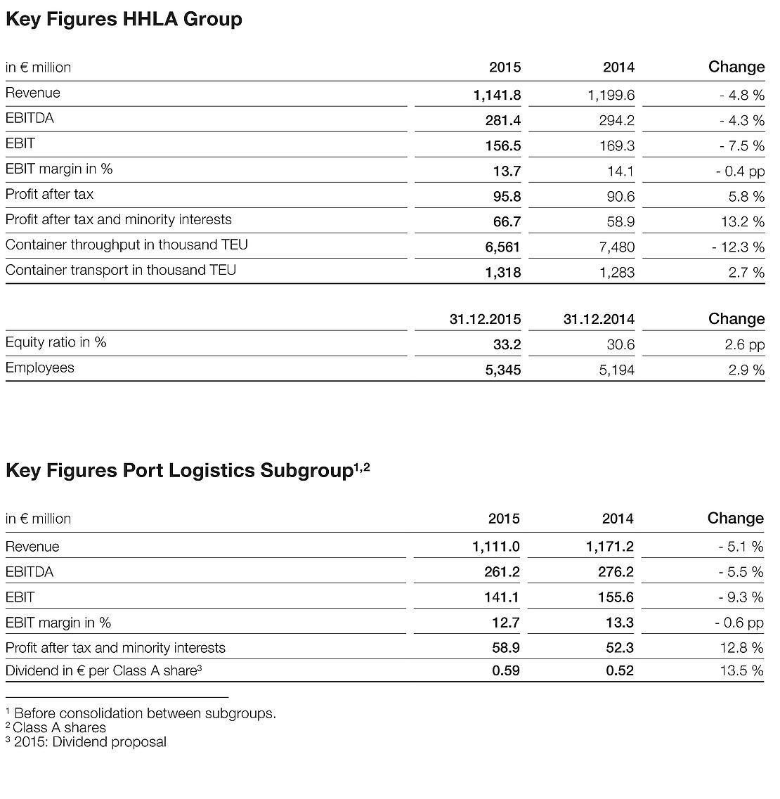 Despite a persistently difficult environment, HHLA generated revenue of € 1.1 billion and an operating result (EBIT) of € 156.5 million in the 2015 financial year. Revenue fell by 4.8 % compared to the previous year and the operating result was 7.5 % lower. By contrast, profit after tax and minority interests increased significantly by 13.2 % to € 66.7 million.