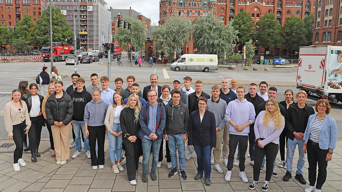 This morning, a new stage of life began for 25 young people at HHLA. Over the coming years, the seven women and 18 men will complete practical training in HHLA’s various facilities and departments as well as its domestic and foreign subsidiaries. Three of the junior employees will complete their apprenticeship mainly at HHLA’s subsidiaries Container-Transport-Dienst (CTD), Metrans Rail Deutschland and FMH Fischmarkt Hamburg-Altona. A total of seven young women and men are starting their technical traineeship as mechatronics engineers at HHLA today. In the future, their expertise will help to maintain and repair the high-performance and partially automated handling equipment at HHLA’s container terminals in Hamburg, thus making a great contribution towards ensuring efficient handling. In addition to the technical area, HHLA also offers commercial apprenticeships, for example as a specialist in digitalisation management. When it comes to dual study course students, HHLA clearly focuses on study programmes in the areas of mathematics, IT, science and technology, such as Computer Engineering, Electrical and IT Engineering and Industrial Engineering.