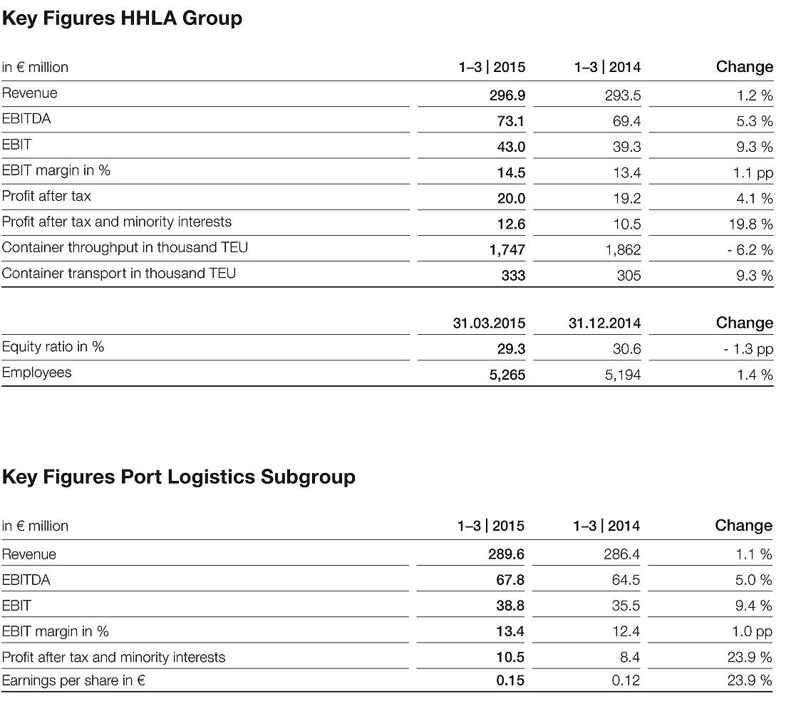 In the first quarter of 2015, Hamburger Hafen und Logistik AG (HHLA) increased its operating result (EBIT) by 9.3 % to € 43.0 million. The operating result increased more than the revenue, which rose by 1.2 % in the first quarter to € 296.9 million. Container throughput declined by 6.2 % to 1.7 million standard containers (TEU). In contrast, the number of containers transported by the HHLA Intermodal companies increased by 9.3 % to 333 thousand TEU.