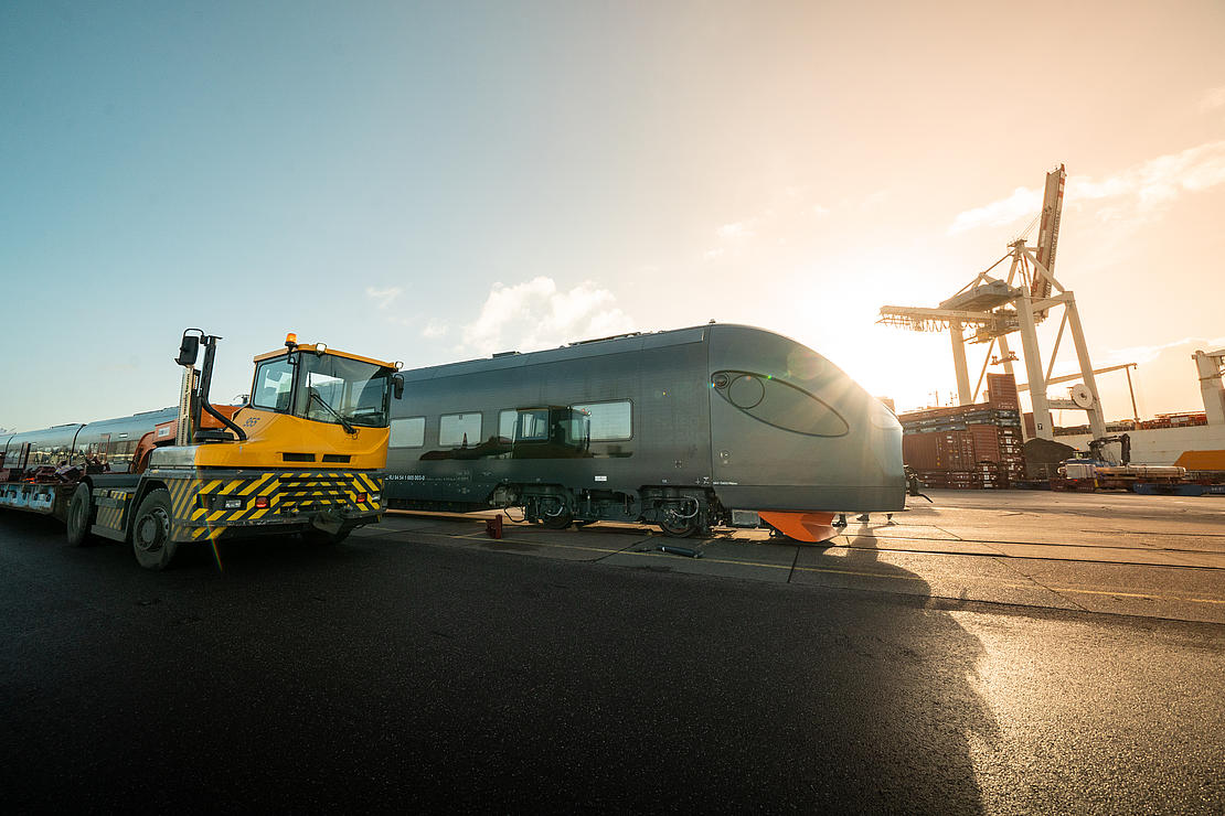 The oversized cargo consisted of six passenger railway carriages, each between 17 and 22 metres long and weighing between 20 and 47 tonnes, as well as the associated bogies. Manufactured in China, the wagons were transported by ocean-going vessel to Hamburg. The Wallmann & Co terminal loaded the wagons onto inland waterway craft that took them to O'Swaldkai, HHLA's universal cargo terminal.