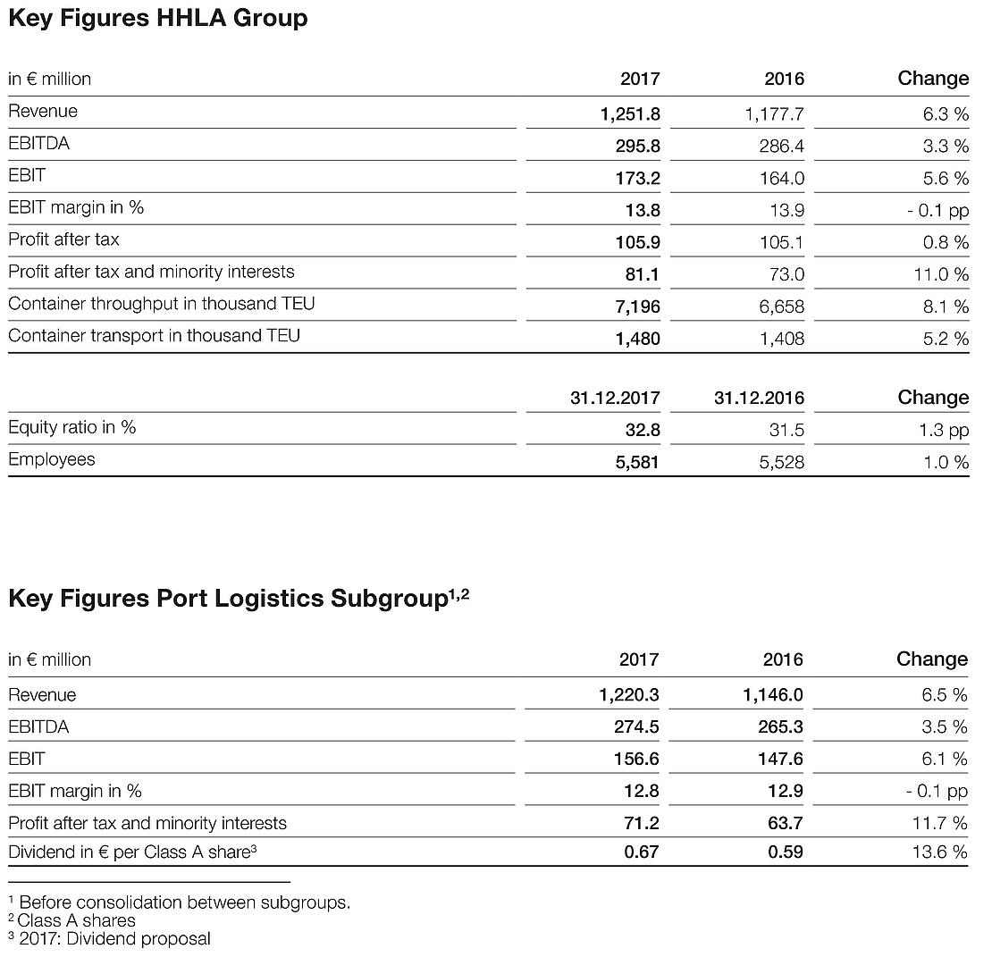 As a result of increased container throughput and container transport, the listed Port Logistics subgroup generated revenue of € 1.22 billion in the 2017 financial year (previous year: € 1.15 billion) and an operating result (EBIT) in the amount of € 157 million (previous year: € 148 million). Lower financing costs led to a rise in net profit allocable to Class A shareholders of 11.7 % to € 71.2 million.