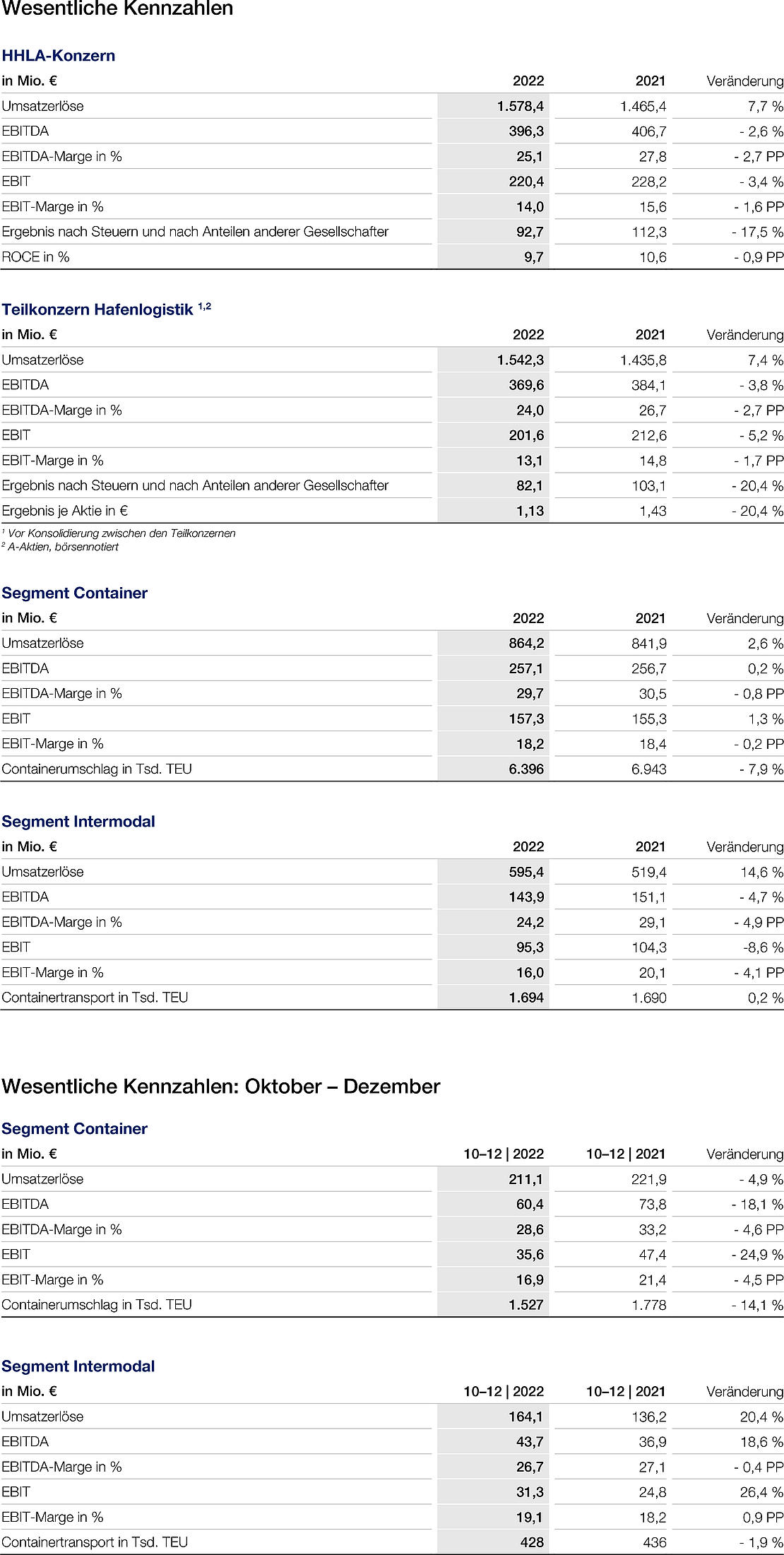 Im börsennotierten Teilkonzern Hafenlogistik stiegen die Umsatzerlöse um 7,4 Prozent auf 1.542,3 Mio. Euro (im Vorjahr: 1.435,8 Mio. Euro). Das Betriebsergebnis (EBIT) sank im Jahresvergleich um 5,2 Prozent auf 201,6 Mio. Euro (im Vorjahr: 212,6 Mio. Euro), lag damit aber deutlich oberhalb der Erwartung von 160 bis 195 Mio. Euro. Positiv auf die Umsatz- und Ergebnisentwicklung im Geschäftsjahr wirkten sich die unterjährig stark erhöhten Lagergelderlöse infolge der anhaltenden Störungen in den globalen Lieferketten aus, die zu längeren Verweildauern von Containern auf den Terminals der HHLA in Hamburg, Tallinn und Triest führten. Ergebnisbelastend wirkten die verringerten Umschlagvolumina, unter anderem durch die Auswirkungen des russischen Angriffskrieges auf den Umschlag am Terminal in Odessa. Hinzu kamen die allgemeinen Kostensteigerungen sowie zusätzlicher Material- und Personalaufwand aufgrund der erhöhten Lagerlast. Der Jahresüberschuss nach Anteilen anderer Gesellschafter reduzierte sich um 20,4 Prozent auf 82,1 Mio. Euro (im Vorjahr: 103,1 Mio. Euro). Das Ergebnis je A-Aktie belief sich damit auf 1,13 Euro (im Vorjahr: 1,43 Euro).