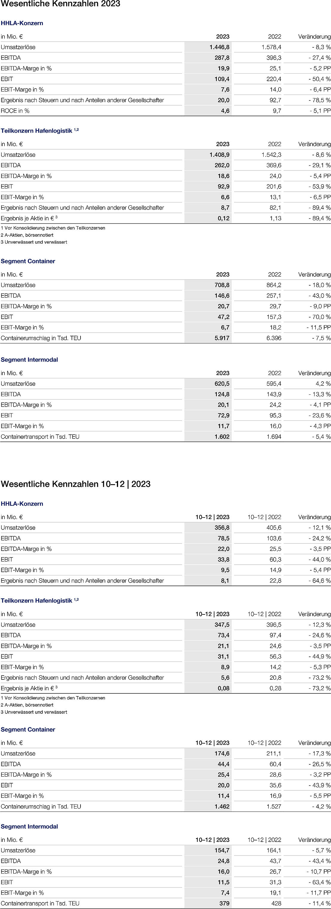 Der börsennotierte Teilkonzern Hafenlogistik verzeichnete 2023 einen Umsatzrückgang um 8,6 Prozent auf 1.408,9 Mio. Euro (im Vorjahr: 1.542,3 Mio. Euro). Ursächlich hierfür war neben der konjunkturbedingt geringeren Menge im Containerumschlag der Rückgang der Lagergelderlöse an den Hamburger Containerterminals, die im Vorjahr durch die gestörten Lieferketten begünstigt worden waren. Das Betriebsergebnis (EBIT) fiel im Jahresvergleich um 53,9 Prozent auf 92,9 Mio. Euro (im Vorjahr: 201,6 Mio. Euro). Die EBIT-Marge belief sich auf 6,6 Prozent und lag damit 6,5 Prozentpunkte unter dem Vorjahr. Der Jahresüberschuss nach Anteilen anderer Gesellschafter reduzierte sich um 89,4 Prozent auf 8,7 Mio. Euro (im Vorjahr: 82,1 Mio. Euro). Das Ergebnis je Aktie belief sich damit auf 0,12 Euro (im Vorjahr: 1,13 Euro).