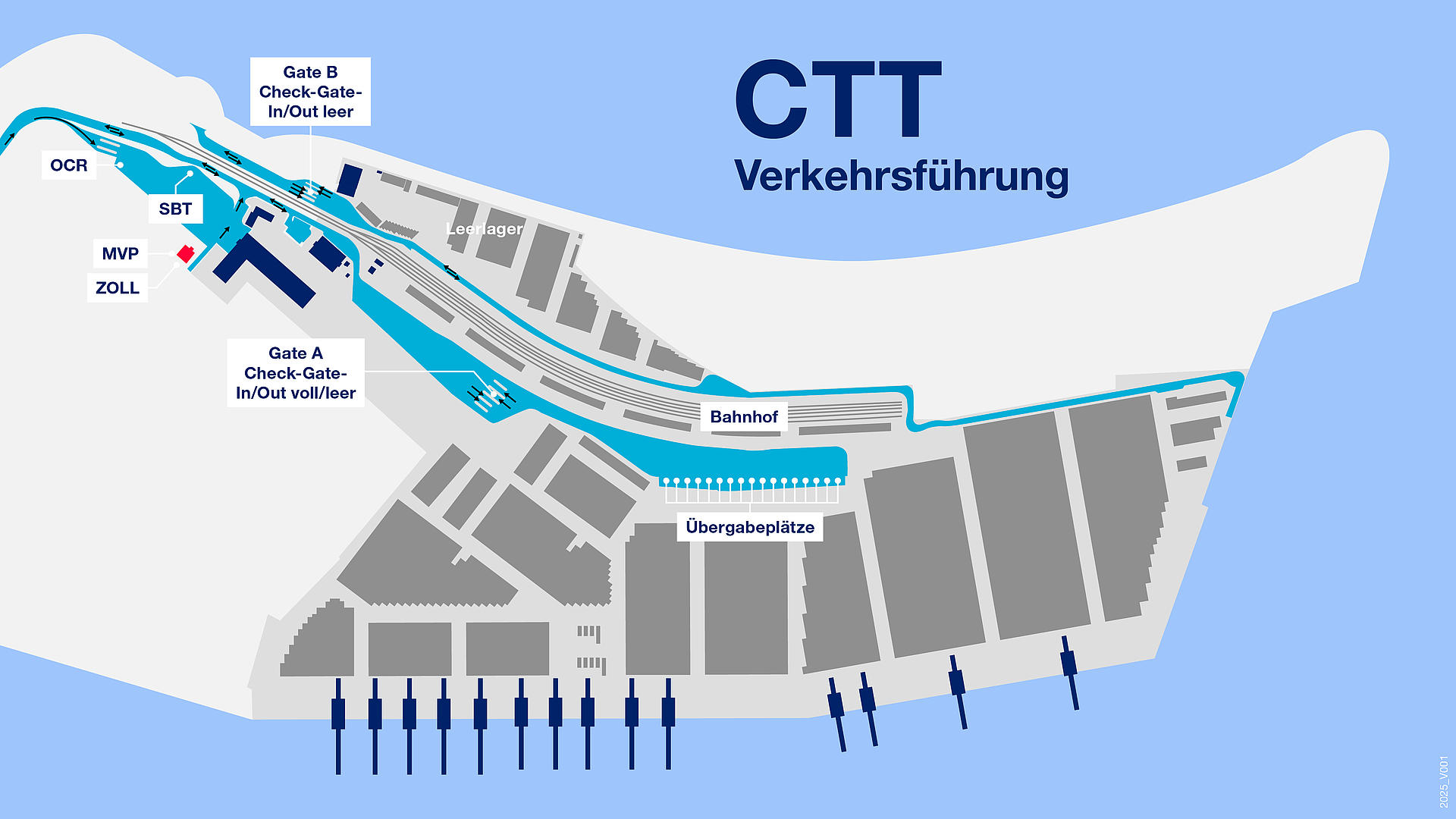 Erfassung von Daten und Containerstatus durch HHLA. Bei Anlieferung Interchange Receipt am Drucker entgegennehmen. Schranke öffnet nach Beendigung des Checkvorganges selbstständig.
