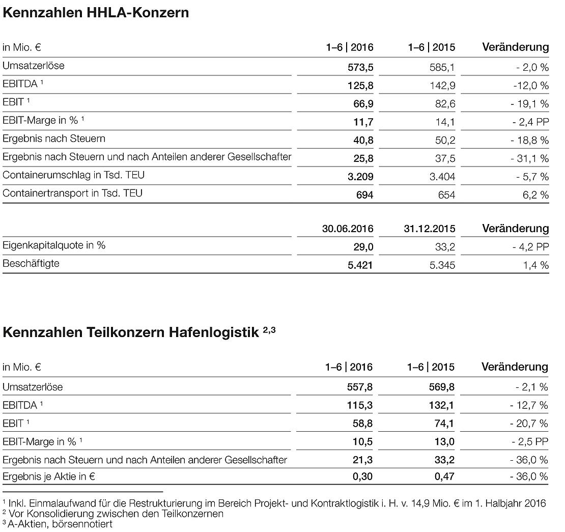 Im ersten Halbjahr 2016 wurden auf den Containerterminals der HHLA mit 3,2 Mio. TEU 5,7 Prozent weniger umgeschlagen als im Vorjahreszeitraum. Während der Container Terminal Odessa mit 132 Tsd. TEU 5,9 Prozent mehr umschlug als im Vergleichszeitraum, ging der Containerumschlag an den Hamburger Terminals um 6,2 Prozent auf 3,1 Mio. TEU zurück. Dies ist im Wesentlichen auf die weiterhin schwachen Asienverkehre (Fernost–Nordeuropa) zurückzuführen, die im Vergleich zum Vorjahreszeitraum um 9 Prozent niedriger ausfielen. Der Umsatz des Segments Container ging unterproportional um 4,4 Prozent zurück und erreichte knapp 337 Mio. Euro. Das Betriebsergebnis (EBIT) des Segments verzeichnete proportional zur Mengenentwicklung einen Rückgang um 5,9 Prozent auf rund 54 Mio. Euro.
