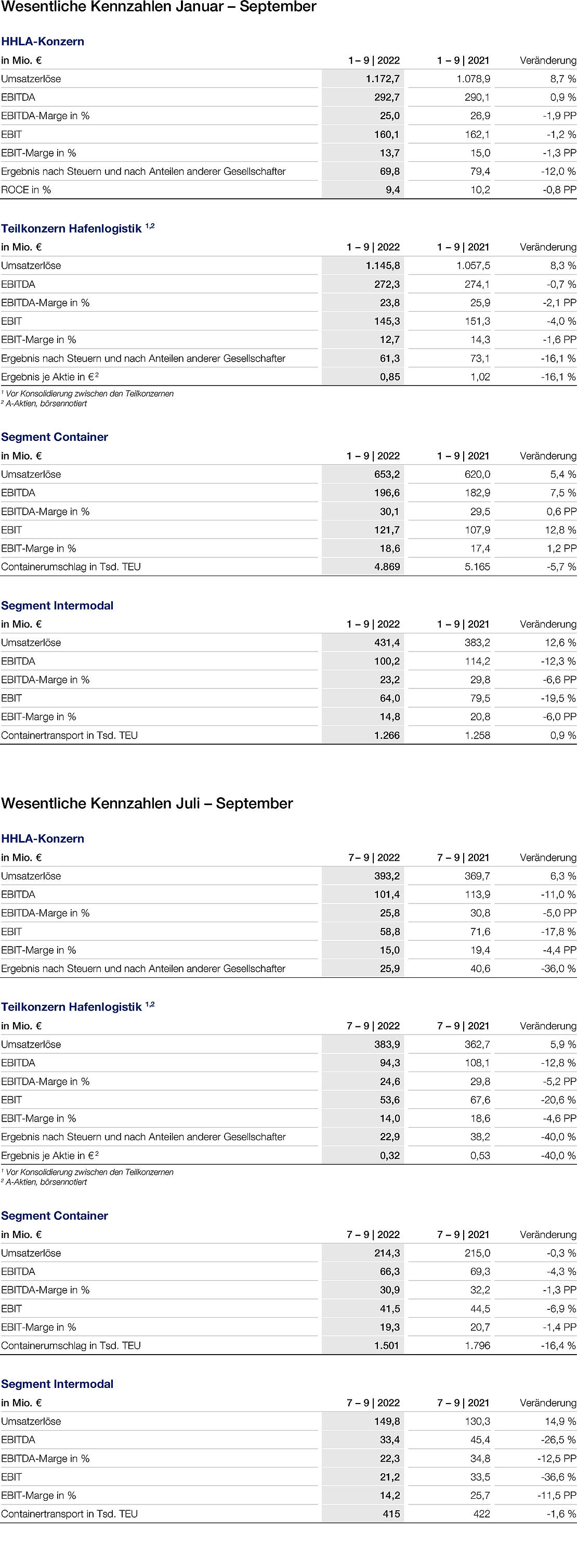 Der Ergebnisverlauf der HHLA in den ersten neun Monaten lag im Wesentlichen im Rahmen der Erwartungen. Jedoch führt die heterogene Entwicklung auf Segmentebene im dritten Quartal zu einer Anpassung der Prognose für das Geschäftsjahr 2022 gegenüber den im Halbjahresfinanzbericht 2022 kommunizierten Erwartungen.