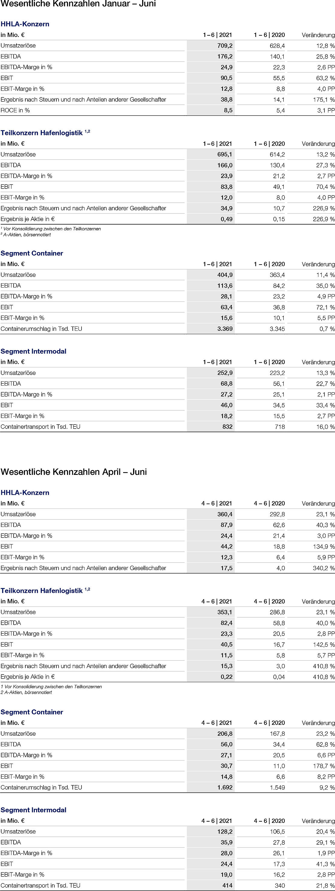 Die Umsatzerlöse erhöhten sich im ersten Halbjahr 2021 gegenüber 2020 um 11,4 Prozent auf 404,9 Mio. Euro (im Vorjahr: 363,4 Mio. Euro). Der geringfügige Mengenzuwachs von 0,7 Prozent wurde durch den Anstieg der Erlösqualität stark übertroffen. Die Durchschnittserlöse je wasserseitig umgeschlagenem Container stiegen gegenüber dem Vorjahreszeitraum um 10,6 Prozent. Ursache hierfür waren ein vorteilhafter Modalsplit mit hohem Anteil an Hinterlandmenge sowie ein temporärer Anstieg der Lagergelder in Folge anhaltender Schiffsverspätungen. Neben pandemiebedingten Verspätungen von Schiffsabfahrten trug auch die Blockade des Sueskanals im März zu längeren Verweildauern bei, die zu einem Anstieg der Lagergeldumsätze führten. Das Betriebsergebnis (EBIT) erhöhte sich vor diesem Hintergrund um 72,1 Prozent auf 63,4 Mio. Euro (im Vorjahr: 36,8 Mio. Euro). Die EBIT-Marge stieg um 5,5 Prozentpunkte und belief sich damit auf ein normalisiertes Niveau von 15,6 Prozent.