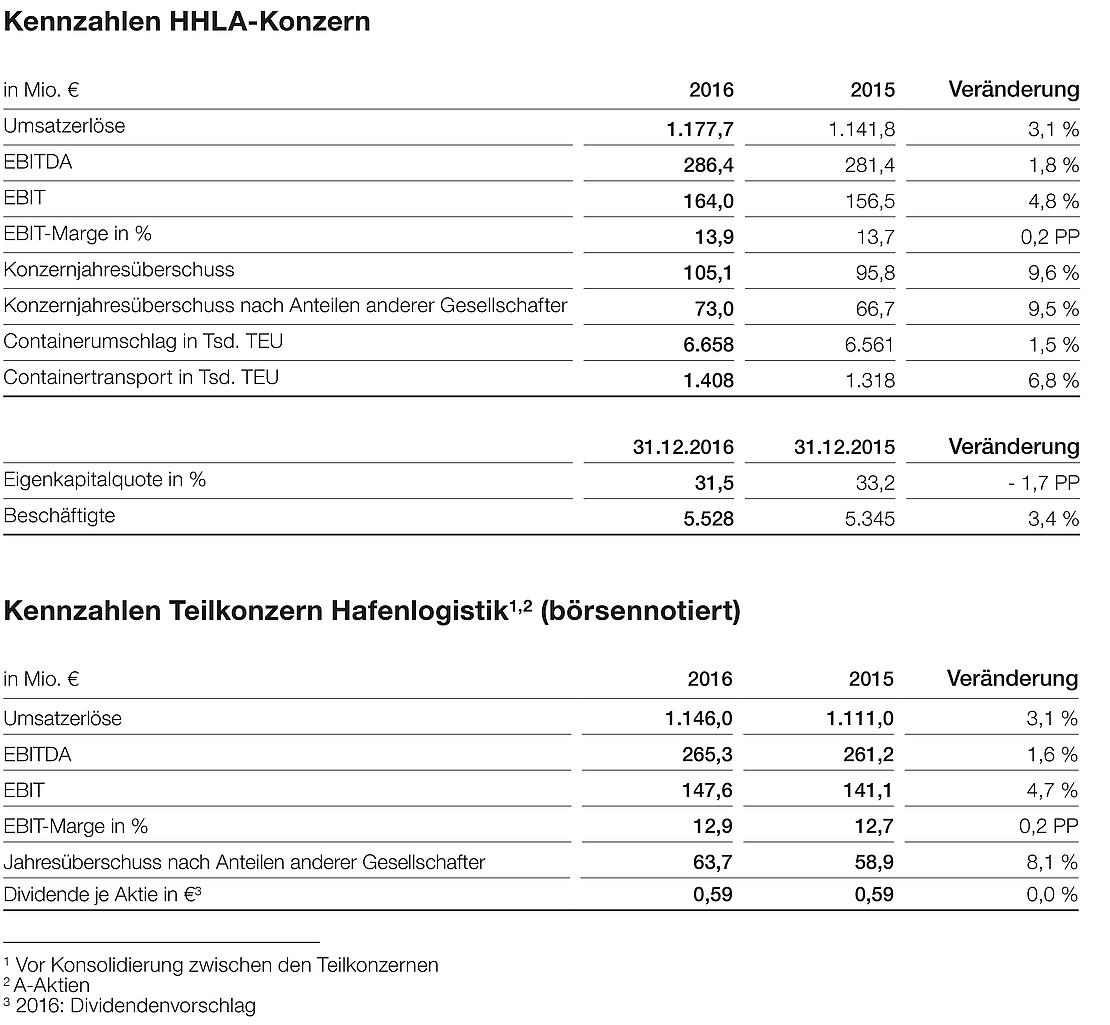 Im Geschäftsjahr 2016 hat die HHLA Konzernumsatzerlöse von knapp 1,2 Mrd. Euro erzielt. Der Teilkonzern Hafenlogistik erwirtschaftete rund 1,1 Mrd. Euro Umsatzerlöse. Sowohl der Konzern als auch der Teilkonzern haben damit den Vorjahreswert um 3,1 Prozent übertroffen. Während das Konzernbetriebsergebnis (EBIT) um 4,8 Prozent auf 164,0 Mio. Euro gesteigert werden konnte, nahm das Betriebsergebnis des Teilkonzerns Hafenlogistik um 4,7 Prozent auf 147,6 Mio. Euro zu. Das Betriebsergebnis lag damit leicht über dem im Herbst vergangenen Jahres prognostizierten Wert.