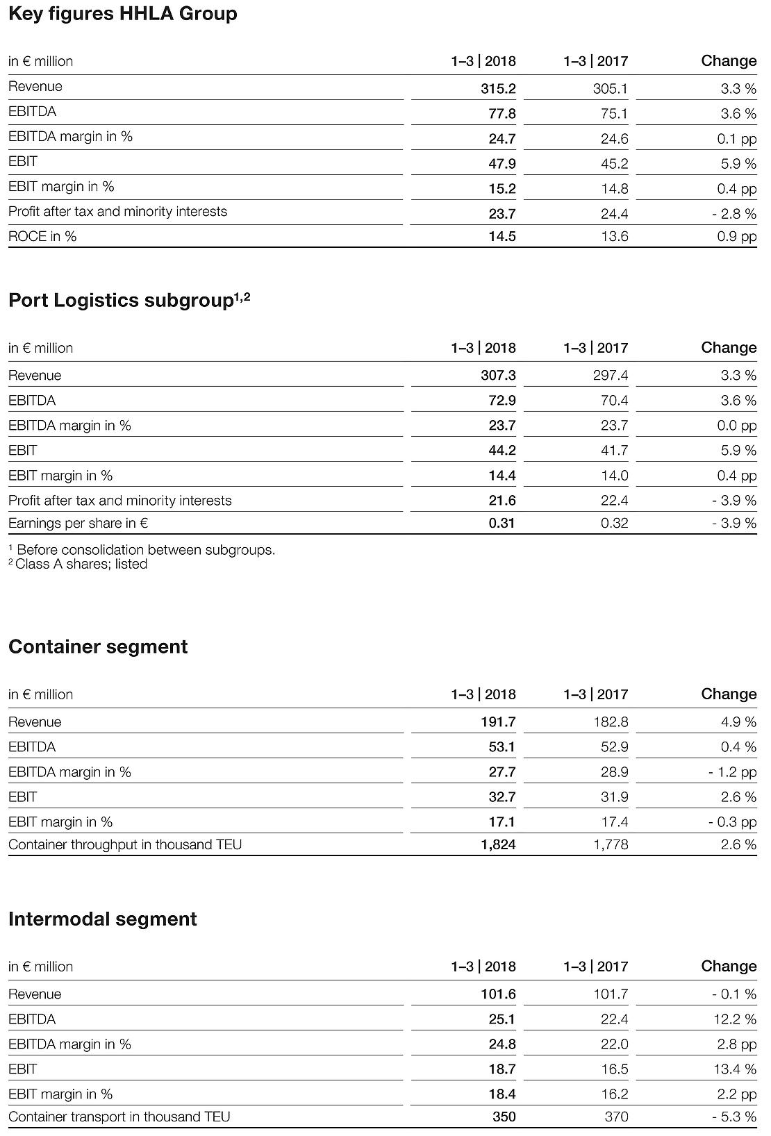 Die Hamburger Hafen und Logistik AG (HHLA) ist erfolgreich in das Geschäftsjahr 2018 gestartet. Sowohl Umsatz als auch operatives Ergebnis konnten auf Konzernebene in den ersten drei Monaten im Vergleich zum Vorjahr gesteigert werden. Beide Teilkonzerne, der börsennotierte Teilkonzern Hafenlogistik und der Teilkonzern Immobilien, trugen zum positiven Jahresauftakt bei. Der Containerumschlag verzeichnete ein Plus von 2,6 Prozent, die Containertransporte hingegen aufgrund der Neuausrichtung der Aktivitäten der Polzug ein Minus von 5,3 Prozent. Der Umsatz im Teilkonzern Hafenlogistik wurde um 3,3 Prozent gesteigert.