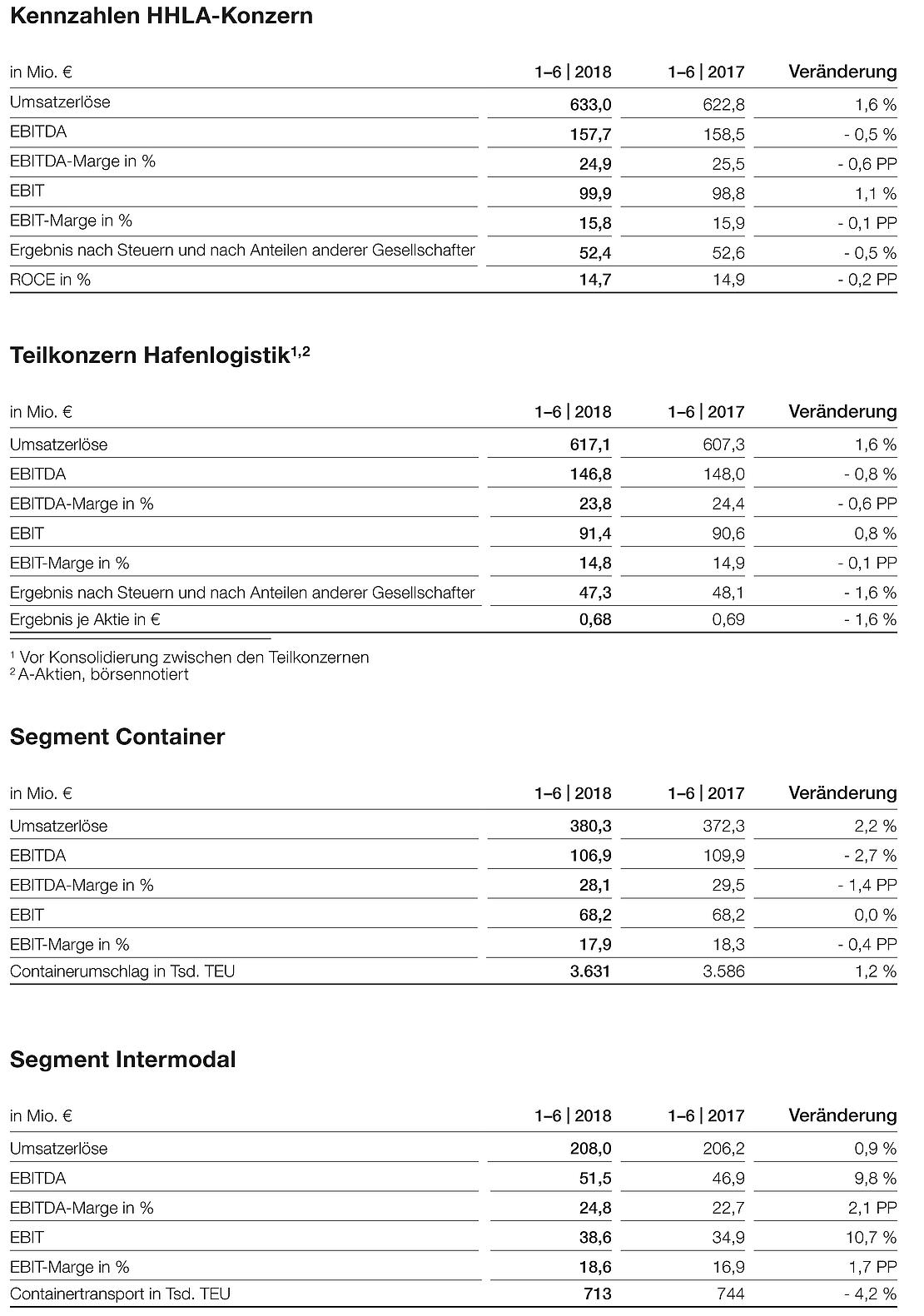 Die Hamburger Hafen und Logistik AG (HHLA) hat im ersten Halbjahr 2018 das bereits starke Vorjahresergebnis übertroffen. Sowohl Umsatz als auch operatives Ergebnis konnten auf Konzernebene in den ersten sechs Monaten im Vergleich zum sehr guten Vorjahr leicht gesteigert werden. Diese Entwicklung wurde von beiden Teilkonzernen, dem börsennotierten Teilkonzern Hafenlogistik und dem Teilkonzern Immobilien, getragen. Der Containerumschlag verzeichnete ein Plus von 1,2 Prozent. Planmäßig gingen die Containertransporte aufgrund der Neuausrichtung der Aktivitäten der Polzug nach der erfolgreichen Integration in die Metrans-Gruppe um 4,2 Prozent zurück. Der Umsatz im Teilkonzern Hafenlogistik wurde um 1,6 Prozent gesteigert.