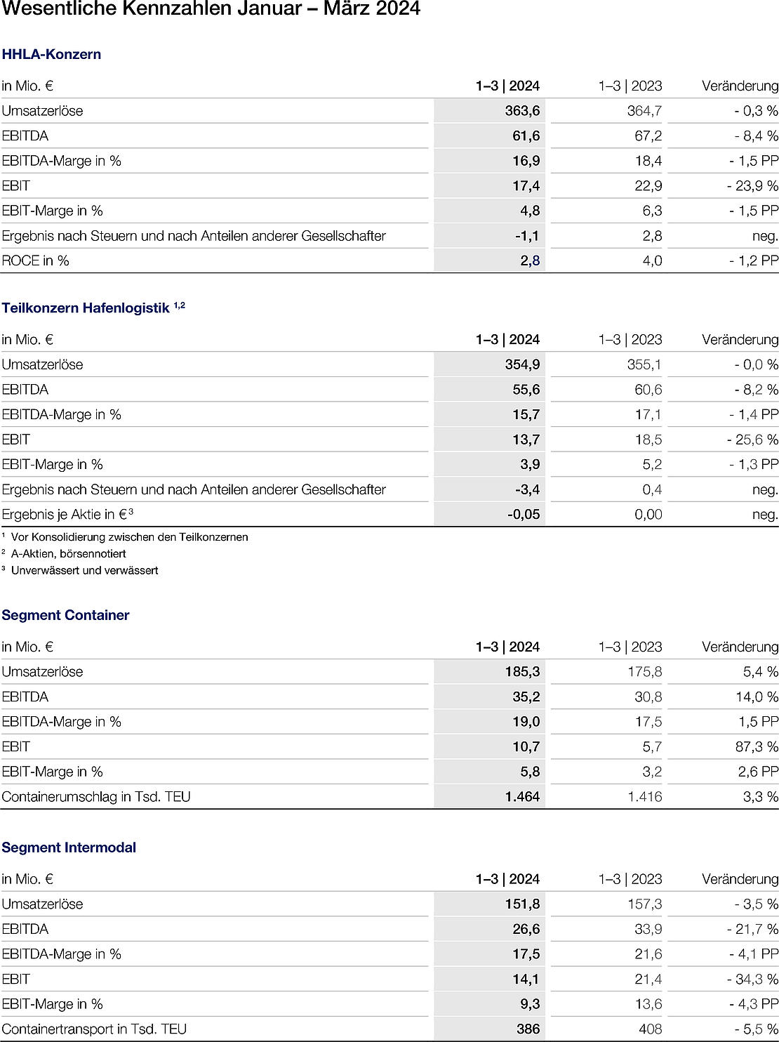 Die Hamburger Hafen und Logistik AG (HHLA) verzeichnete in den ersten drei Monaten des Jahres 2024 eine rückläufige Umsatz- und Ergebnisentwicklung. Das von andauernden Krisen und zunehmenden geopolitischen Spannungen geprägte Umfeld belastete die weltwirtschaftliche Entwicklung weiter. Zudem führte der militärische Konflikt im Roten Meer zu Jahresbeginn zu deutlichen Schiffsverspätungen und -ausfällen in den europäischen Häfen, was sich auch auf die Hinterlandverkehre auswirkte. Vor diesem Hintergrund reduzierte sich der Konzernumsatz im ersten Quartal geringfügig um 0,3 Prozent auf 363,6 Mio. Euro (im Vorjahr: 364,7 Mio. Euro). Das Konzern-Betriebsergebnis (EBIT) verringerte sich infolge inflationsbedingter Kostensteigerungen und letztjähriger Sondereffekte um 23,9 Prozent auf 17,4 Mio. Euro (im Vorjahr: 22,9 Mio. Euro). Die EBIT-Marge betrug 4,8 Prozent nach 6,3 Prozent im Vorjahr. Das Konzernergebnis nach Anteilen anderer Gesellschafter belief sich auf - 1,1 Mio. Euro (im Vorjahr: 2,8 Mio. Euro).
