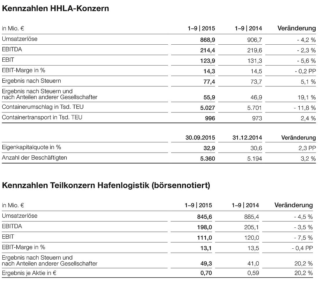 Erfreulich ist das für Aktionäre relevante Ergebnis nach Steuern und nach Anteilen anderer Gesellschafter für den Teilkonzern Hafenlogistik. Dieses erhöhte sich aufgrund der insgesamt positiven Entwicklung der Gesellschaften mit überwiegendem HHLA-Anteil um 20,2 Prozent auf 49,3 Mio. € in den ersten drei Quartalen des Jahres 2015. Das Ergebnis je A-Aktie lag mit 0,70 € ebenfalls um 20,2 Prozent über dem Vorjahreswert von 0,59 €.