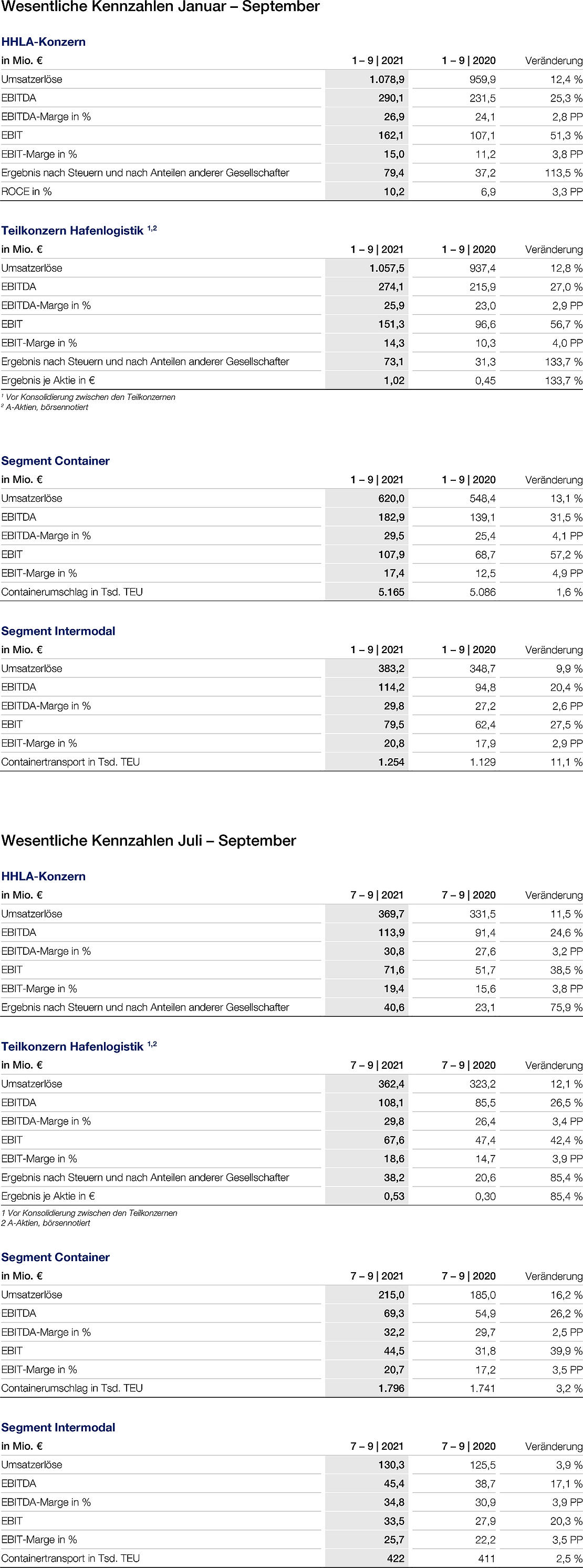 Die Hamburger Hafen und Logistik AG (HHLA) verzeichnete in den ersten neun Monaten des Jahres eine starke Umsatz- und Ergebnisentwicklung. Positiv wirkten sich insbesondere der temporär starke Anstieg der Lagergelderlöse als Folge einer längeren Verweildauer von Containern auf den Hamburger Terminals der HHLA aus. Ursache dafür sind die anhaltend gestörten globalen Lieferketten. Darüber hinaus profitierte die HHLA von einem starken Anstieg der Containertransportmengen. Das Konzern-Betriebsergebnis (EBIT) stieg vor diesem Hintergrund um 51,3 Prozent gegenüber dem Vorjahreszeitraum auf 162,1 Mio. Euro. Im Teilkonzern Immobilien stieg das Betriebsergebnis (EBIT) trotz leicht rückläufiger Umsatzerlöse leicht an. In Summe stiegen die Umsatzerlöse des HHLA-Konzerns im Mitteilungszeitraum um 12,4 Prozent auf 1.078,9 Mio. Euro (im Vorjahr: 959,9 Mio. Euro).