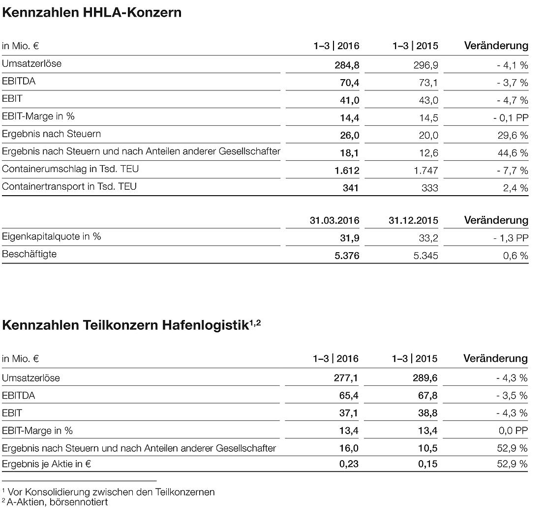 Die Hamburger Hafen und Logistik AG (HHLA) startete erwartungsgemäß in das Geschäftsjahr 2016. Während der Containertransport um gut 2 Prozent auf 341 Tsd. Standardcontainer (TEU) zunahm, ging der Containerumschlag um knapp 8 Prozent auf 1,6 Mio. TEU zurück. Mit knapp 285 Mio. Euro lagen die Umsatzerlöse um gut 4 Prozent unter dem Vorjahreswert, das Betriebsergebnis (EBIT) sank um knapp 5 Prozent auf rund 40 Mio. Euro. Demgegenüber legte das Ergebnis nach Steuern und nach Anteilen anderer Gesellschafter um knapp 45 Prozent auf gut 18 Mio. Euro zu.