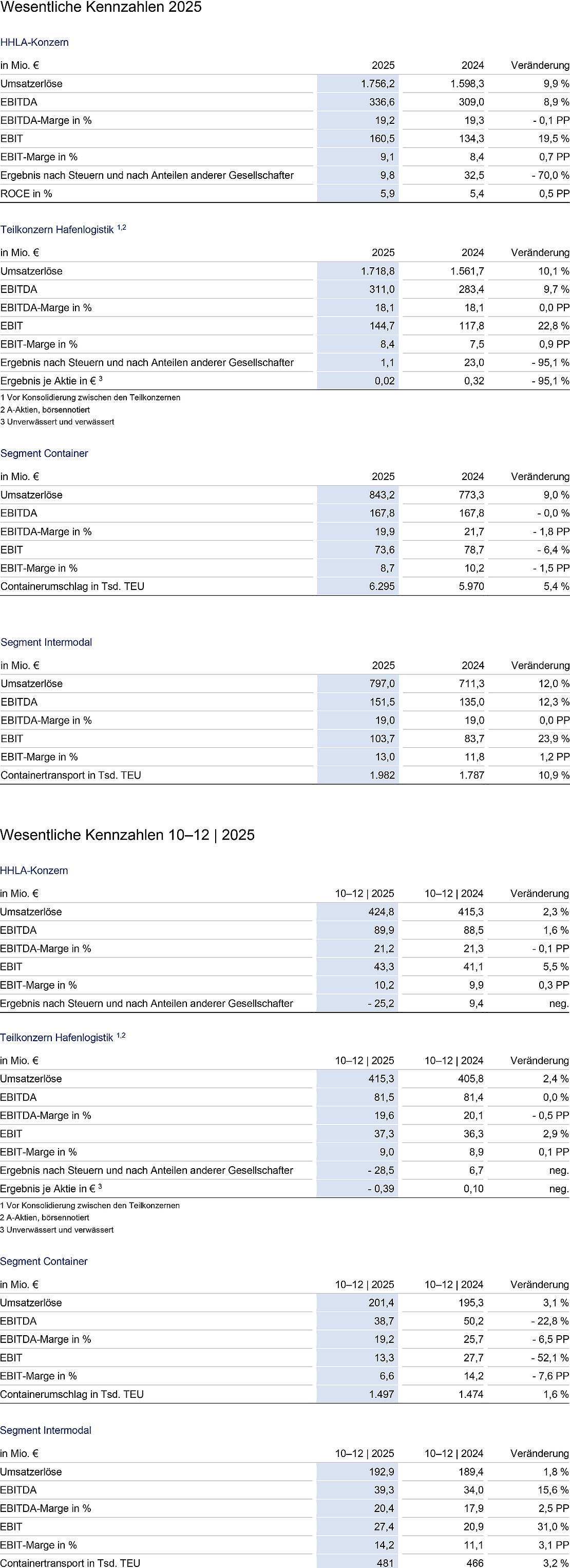 Im börsennotierten Teilkonzern Hafenlogistik stiegen die Umsatzerlöse um 10,1 Prozent auf 1.718,8 Mio. Euro (im Vorjahr: 1.561,7 Mio. Euro). Das Betriebsergebnis (EBIT) erhöhte sich im Jahresvergleich um 22,8 Prozent auf 144,7 Mio. Euro (im Vorjahr: 117,8 Mio. Euro). Die operative Geschäftsentwicklung 2025 war insgesamt von einer positiven Mengenentwicklung im Umschlag und im Transport gekennzeichnet, die sich trotz Abschwächung im zweiten Halbjahr durch zunehmende weltwirtschaftliche Unsicherheiten und anhaltende Lieferkettenstörungen bei zugleich weitreichenden Umbaumaßnahmen zur Automatisierung der Hamburger Anlagen im laufenden Betrieb insgesamt stabil entwickelte. Demgegenüber ist der Jahresüberschuss nach Anteilen anderer Gesellschafter stark durch steuerliche Einmaleffekte – im Wesentlichen Wertberichtigungen auf aktive latente Steuern – belastet und beläuft sich auf 1,1 Mio. Euro (im Vorjahr: 23,0 Mio. Euro). Dies entspricht einem Ergebnis je A-Aktie von 0,02 Euro (im Vorjahr: 0,32 Euro).
