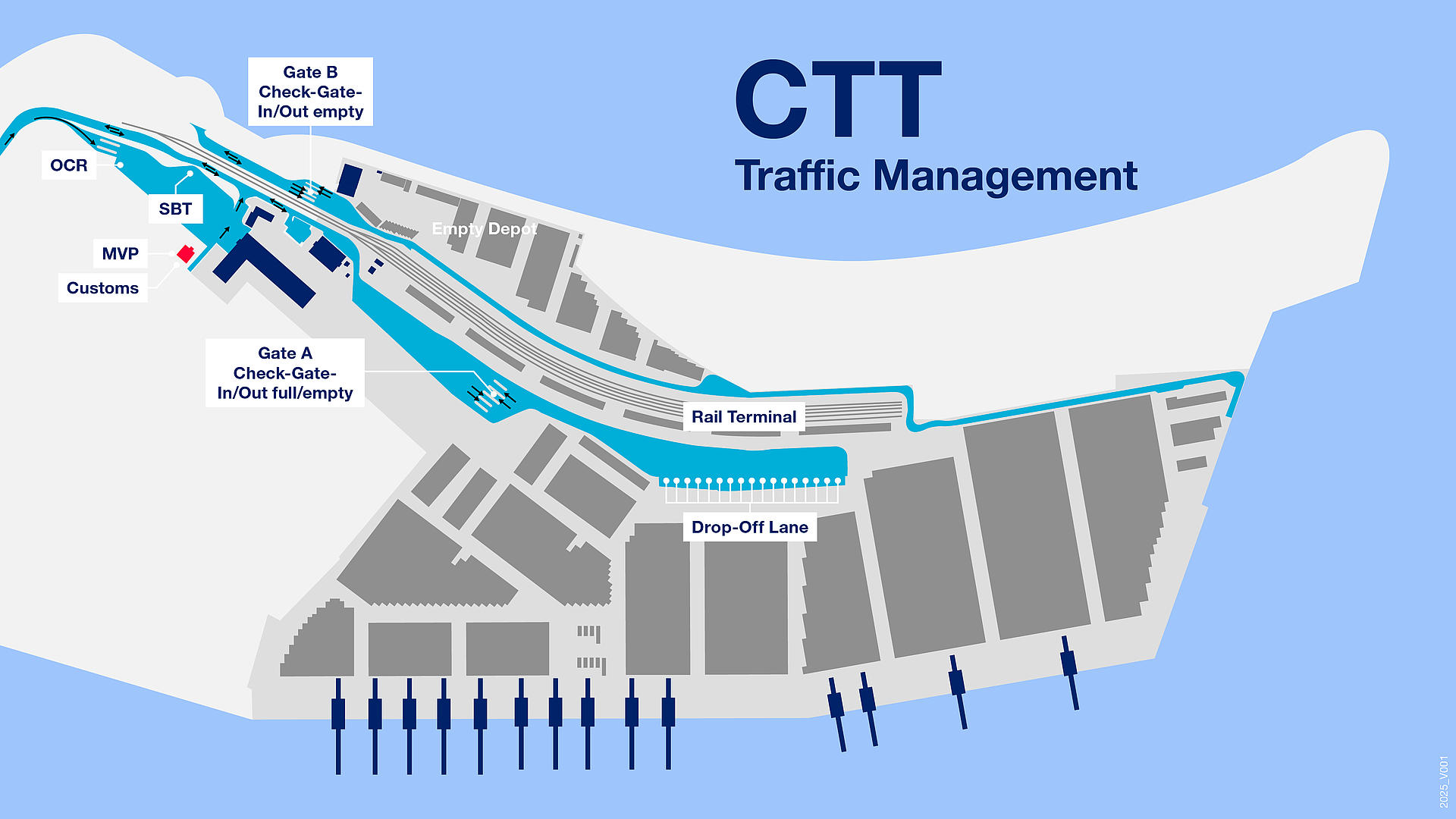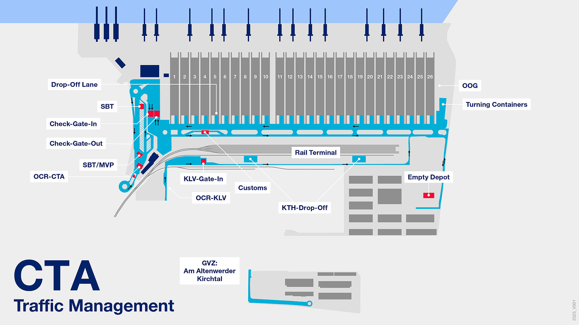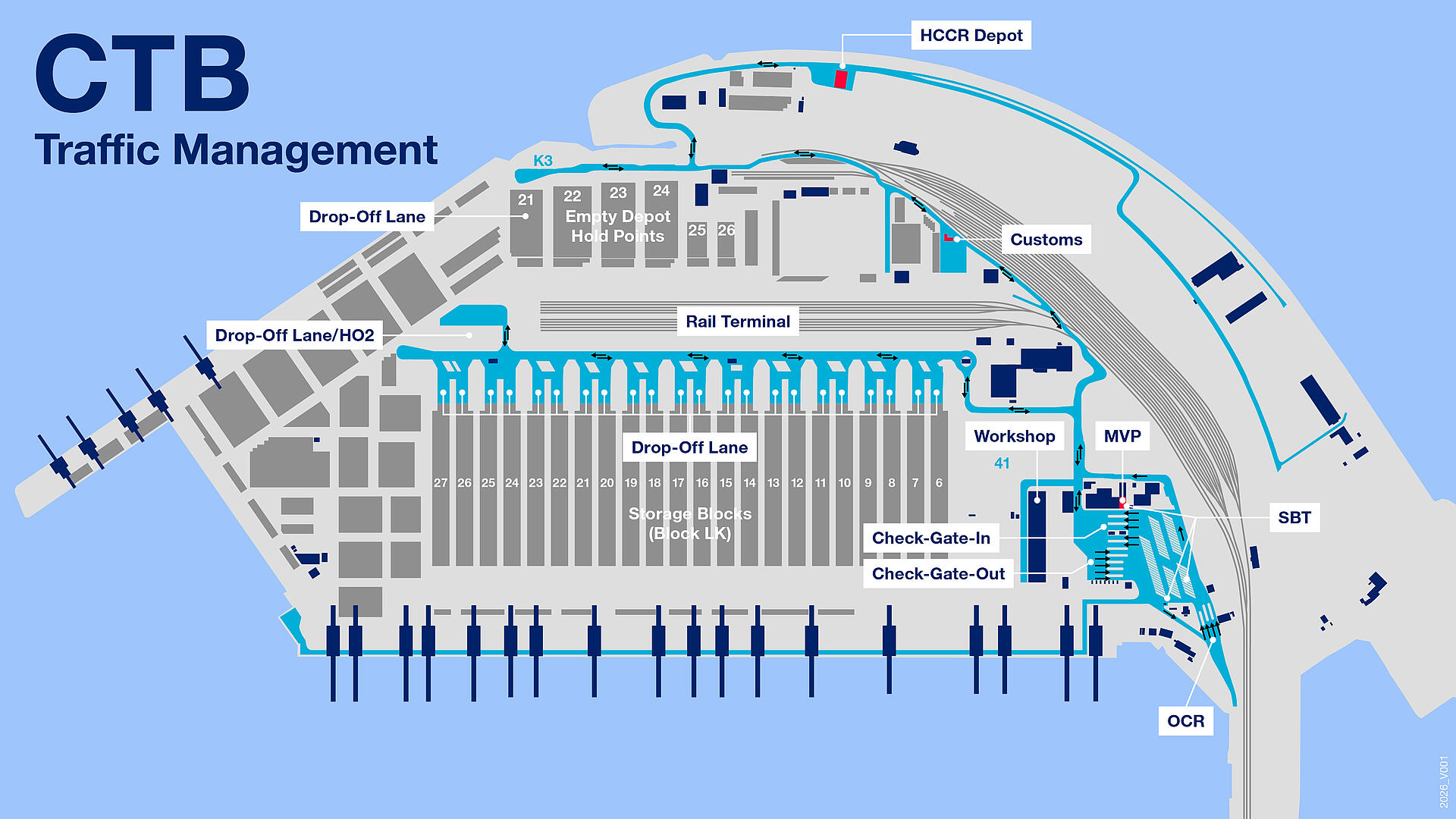 After entering the lane - disembark - identification at transponder column. Container is removed from or placed on the lorry by remote control. The safety area (marked yellow) must not be left during check-in.