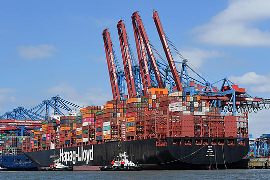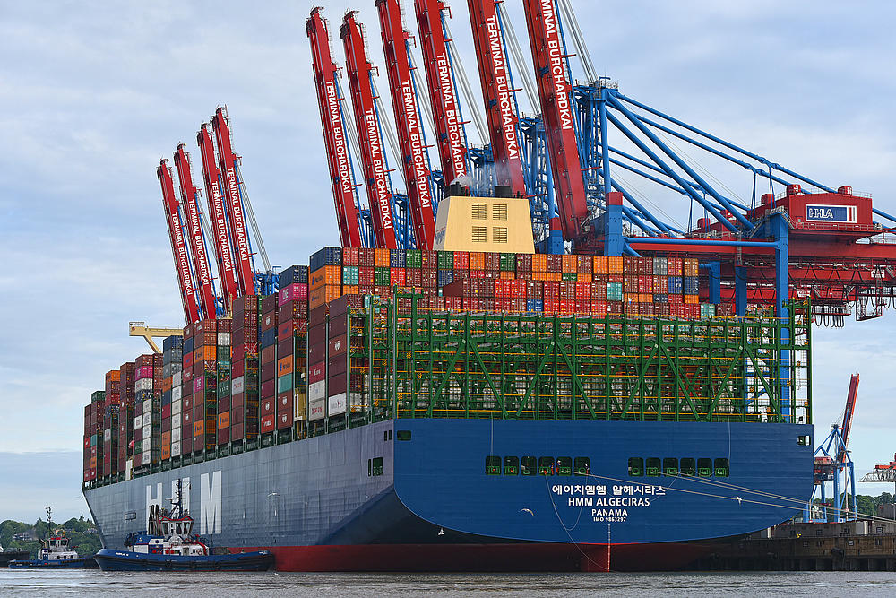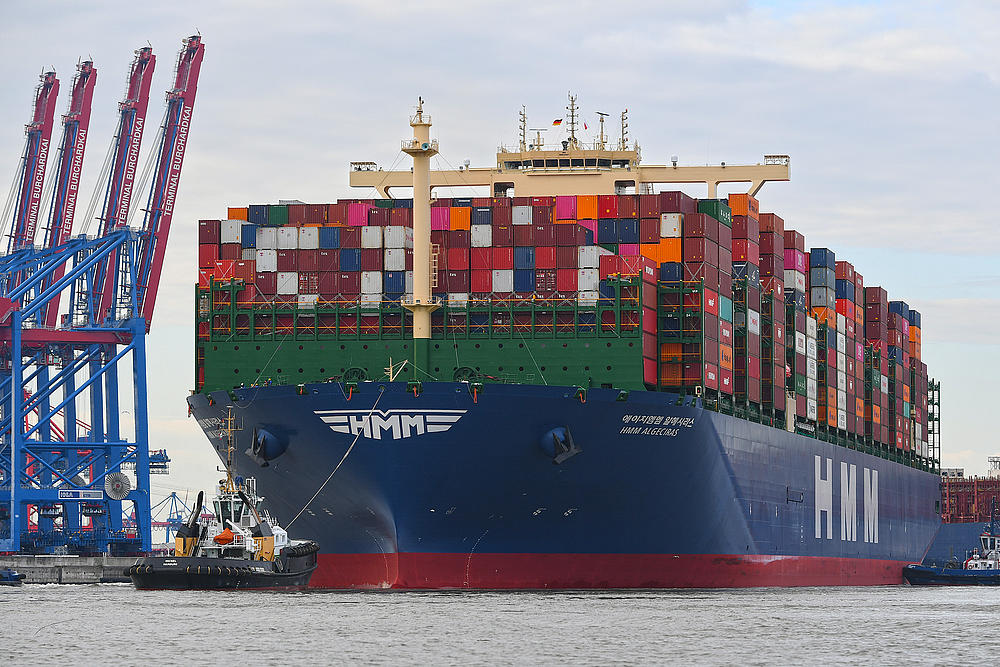 HMM Hamburg is positioned by tugs at its berth at HHLA Container Terminal Burchardkai.