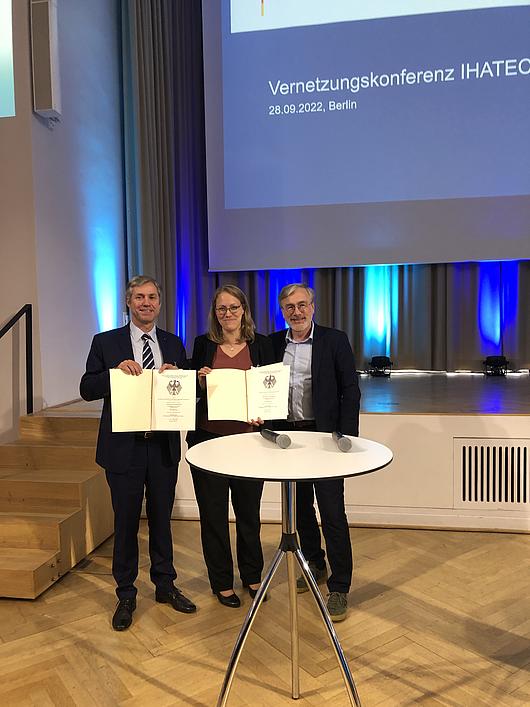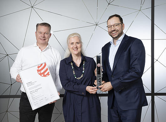 Matthias Gronstedt, Managing Director HHLA Sky, Angela Titzrath, CEO HHLA, and Lars Neumann, Director Logistics HHLA, are pleased about the Red Dot Award.