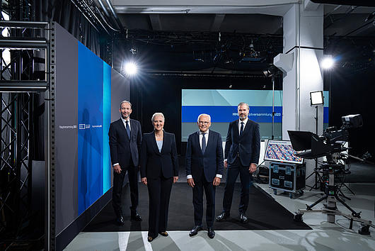 HHLA Executive Board with Supervisory Board Chairman at the 2023 Annual General Meeting (from left to right: HHLA Executive Board member Jens Hansen, HHLA Executive Board Chairwoman Angela Titzrath, Supervisory Board Chairman Prof. Dr. Rüdiger Grube, HHLA Executive Board member Torben Seebold)
