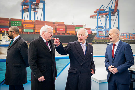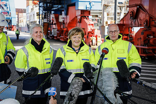 Chancellor Dr Angela Merkel visited the HHLA Container Terminal Altenwerder (CTA), welcomed by the Chairwoman of HHLA’s Executive Board, Angela Titzrath, and Hamburg’s First Mayor, Dr Peter Tschentscher.