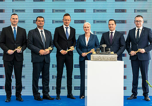 fLTR - Zalaegerszeg’s mayor Zoltán Balaicz; Member of Hungarian Parliament László Vígh; the Hungarian Foreign Minister Péter Szijjártó; Chairwoman of HHLA’s Executive Board Angela Titzrath; László Nagy of Metrans Ungarn and Chairman of the Executive Board of the Metrans Group Peter Kiss