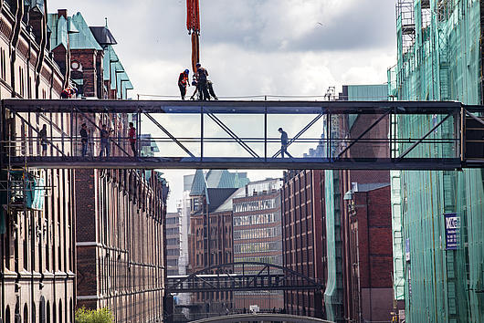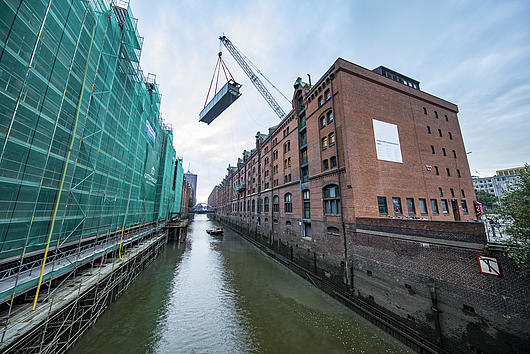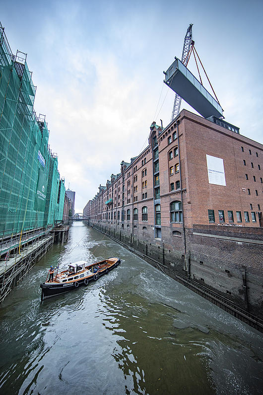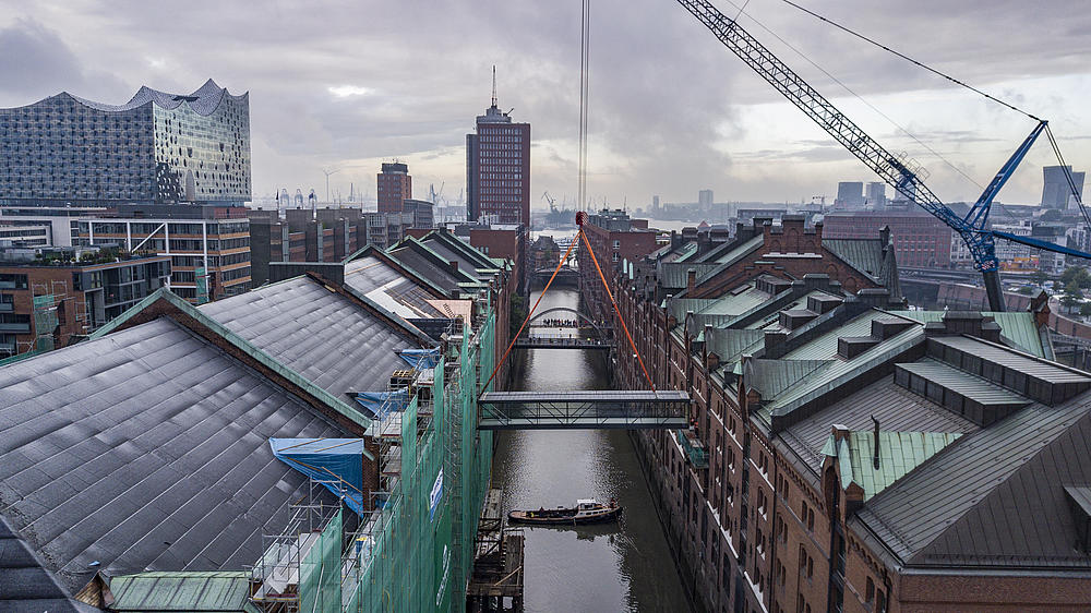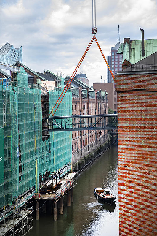 Lifting of the new canal bridge in the Speicherstadt.
