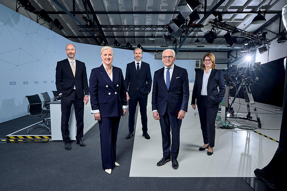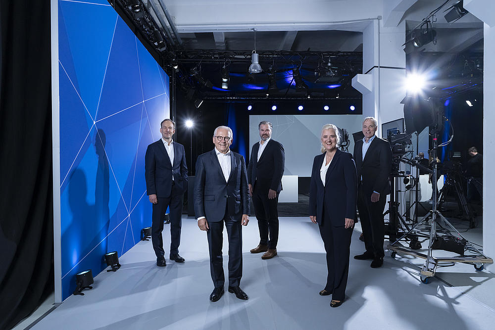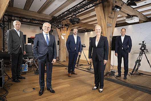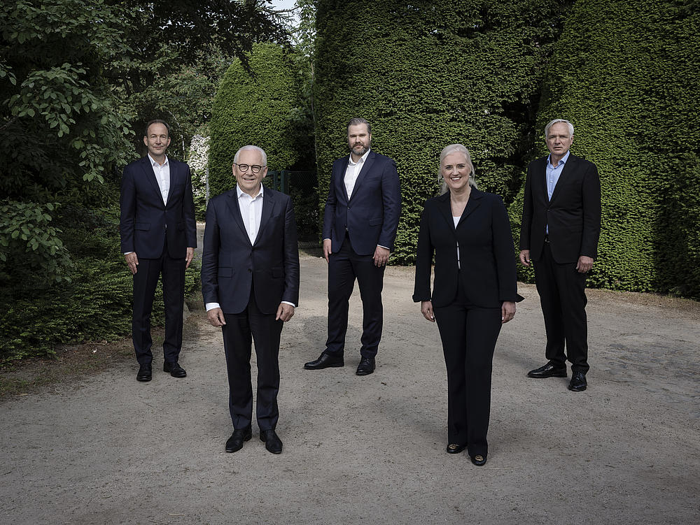 HHLA Executive Board with Supervisory Board Chairman at the 2021 Annual General Meeting (from left to right: HHLA Executive Board member Jens Hansen, Supervisory Board Chairman Prof. Dr. Rüdiger Grube, HHLA Executive Board member Torben Seebold, HHLA Executive Board Chairwoman Angela Titzrath, HHLA Executive Board member Dr. Roland Lappin)